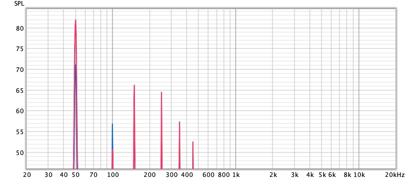 Далее шумы - синяя линия - мой, красная - Хагерман. Гибрид значительно тише Хагермана на 50 гц.