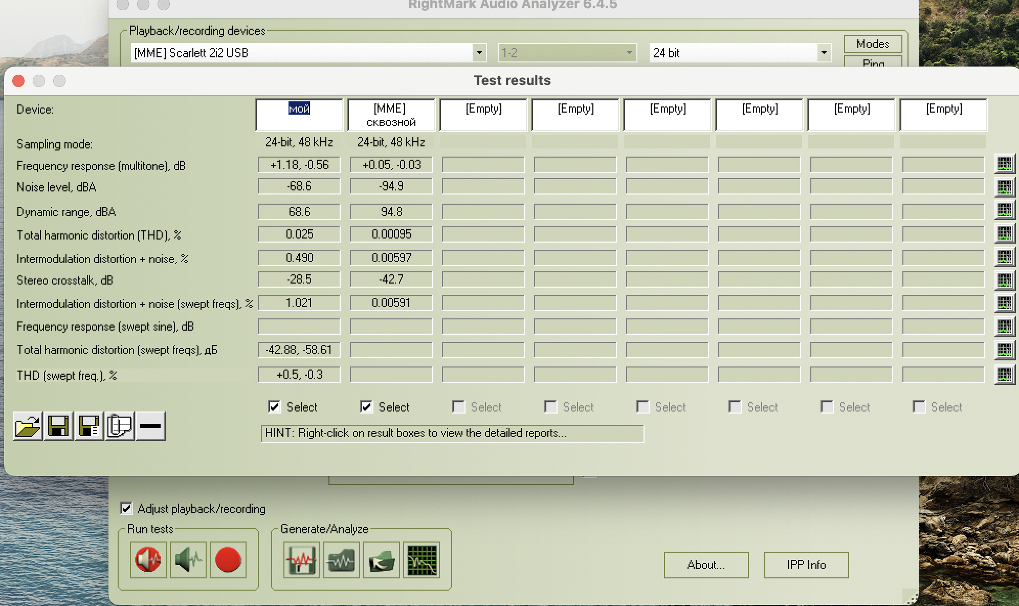 Длинный минус ( крайняя справа иконка из пяти) это вычитание из получившегося результата измерений самой звуковой платы, так же сохранённые в папке. Это когда у звуковой карты вход идёт на выход. С этого надо начинать и добиться наилучших результатов. Далее при измерении своих девайсов придерживаемся таких же или близких настроек.