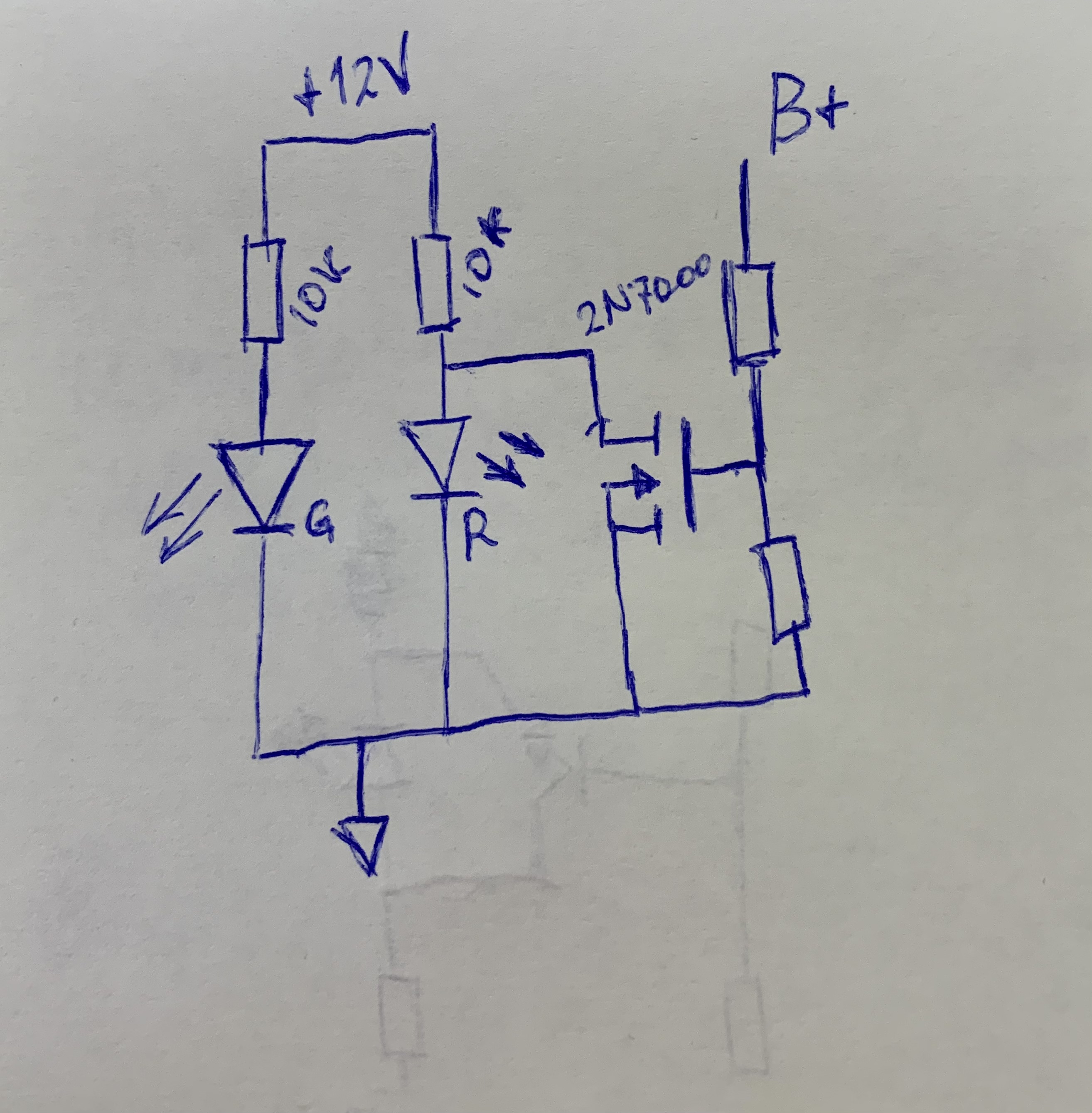 Вот такой вариант. Взять сдвоенный светодиод, когда горят обе части он светиться красным, это происходит до тех пор, пока не поступит b+, ключ откроется и красная половинка светодиода погаснет, останется только зеленое свечение. Но при этом ток на землю от 12 вольт все равно протекает через 10к резистор. В принципе мне на него совершенно все равно, для накала 1.2мА это незаметно.