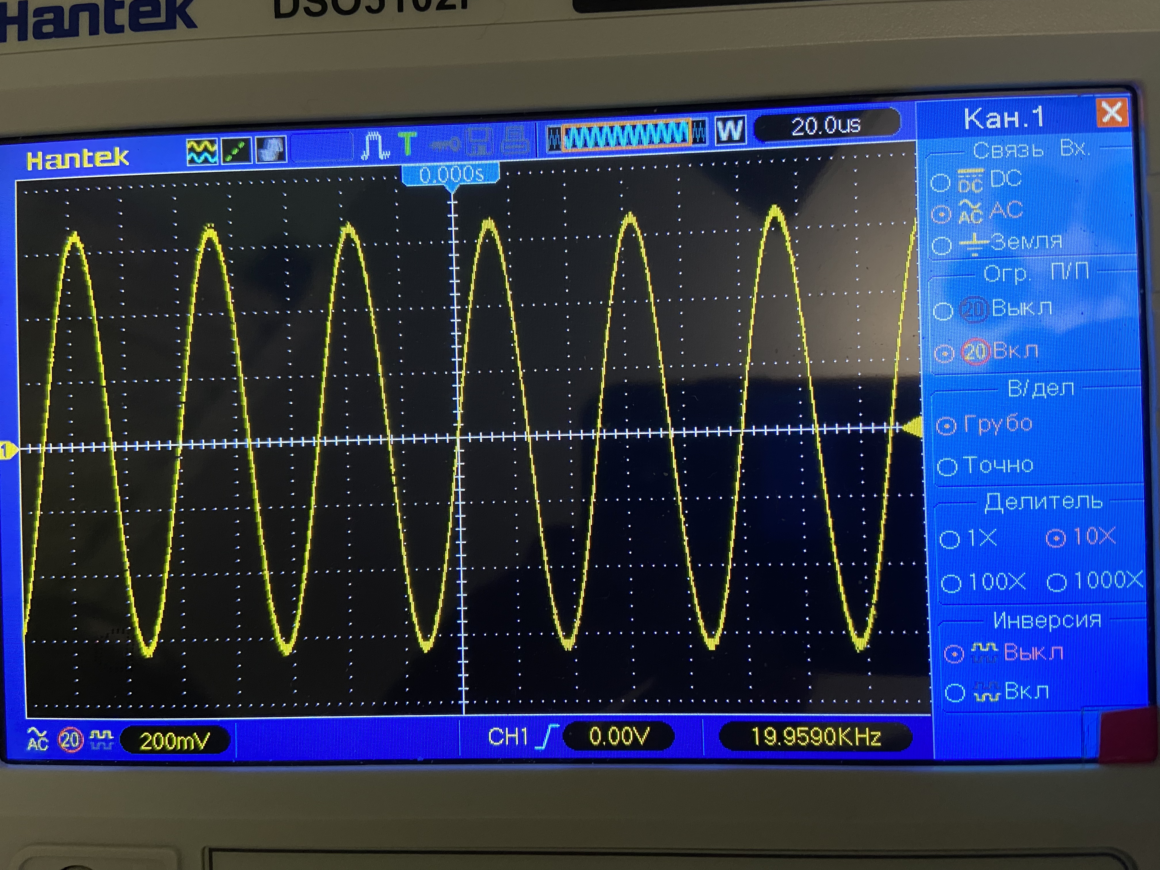 Включил- 200 мВ минималка. А расхваливали его когда то. В нем цифровой ереси, кроме синуса и прямоугольника тьма чего есть. А 1 мВ не можешь! Возвращаемся к совку. Подключаю антиRIAA к генератору, выход с платы никуда не подключая ( только осциллограф висит) вижу 10 кГц пик-пик 103 мВ. Переключаю на 20 кГц получаю пик- пик 56,8 мВ! Тоже на обоих выходах генератора.