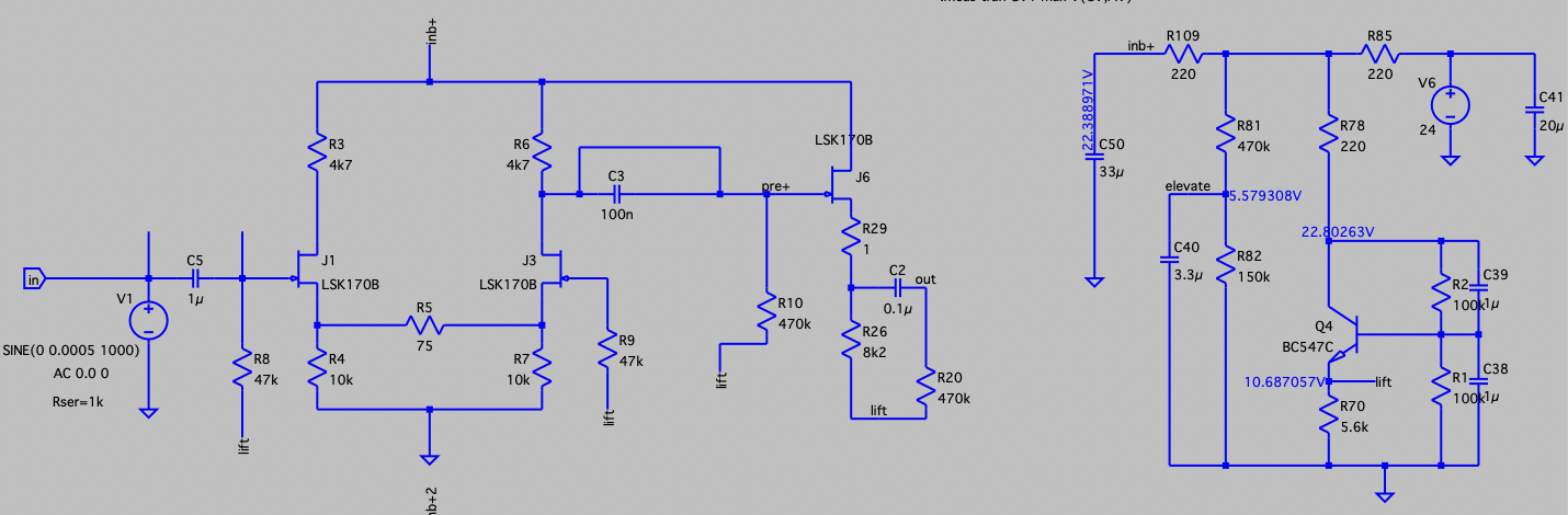 - применяя п. 3: нам не стоит создавать предпосылки положительного напряжения на затворе. Из этого следует, что напряжение сигнала, подающееся на вход не должно превышать по амплитуде отрицательного напряжения на затворе. Насколько я помню, Хагерман заявляет о допустимом напряжении 1В на входе, что создаёт нам ориентировочную рабочую точку в 1,1 мА. Фактически - твой первый каскад является повторением Хагермановского (ну, кроме C5).