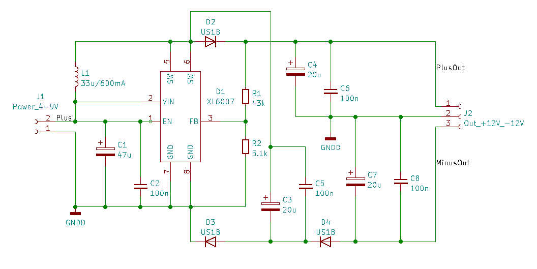 Эффективность его достигает 90%, поэтому батарейку будет тратить очень экономно. Диоды обязательно импульсные или высокочастотные, с временем обратного восстановления не более 50нс (лучше 35 и ниже) и обратным напряжением >100В. Дроссель должен иметь запас примерно 5 раз по току по отношению к выходному току (примерный расчёт Iинд = 2*Uвых*Iвых/(0,8*Uвх) ). Можно, допустим, Bourns SDR0805-330KL (16 руб. в Чипе), Murata LQH55DN330M03L (34 р.) и др.