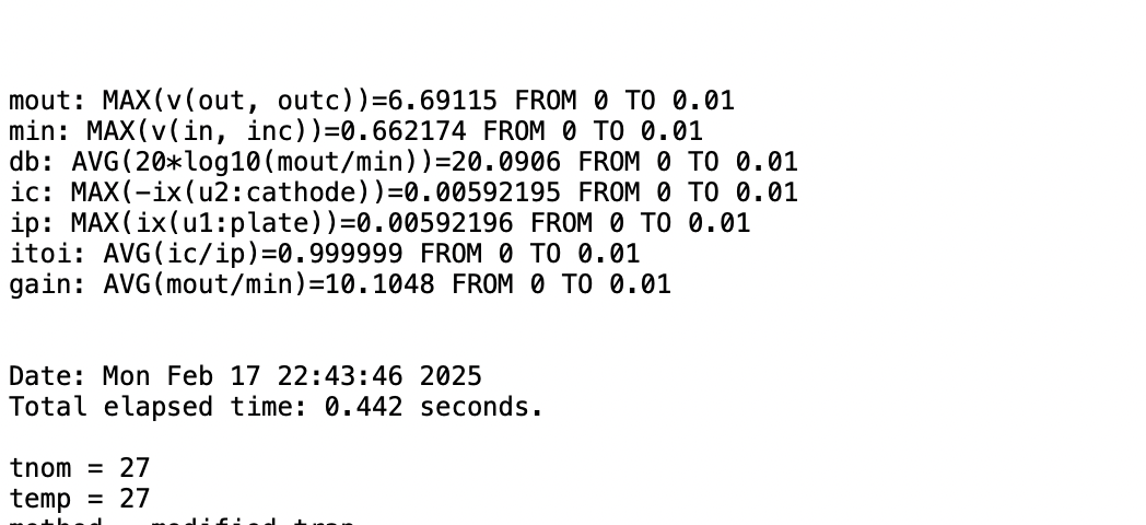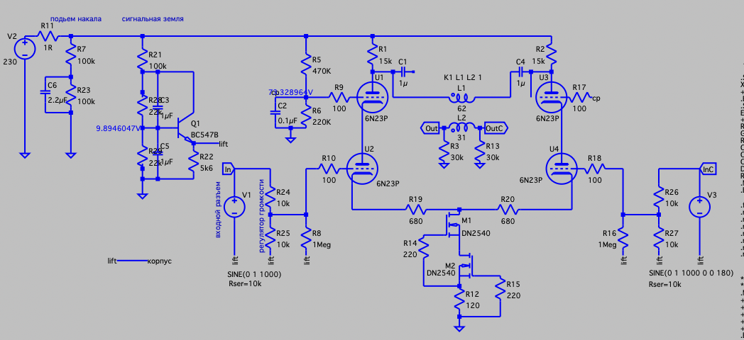 Перенес in на сетки ламп (мы же считаем усиление самой схемы - сколько пришло и сколько вышло) - и вот оно! Гейн получился 10. Это с учетом того, что выходной трансформатор сконфигурирован 2к1 Получается до трансформатора там еще усиление больше.