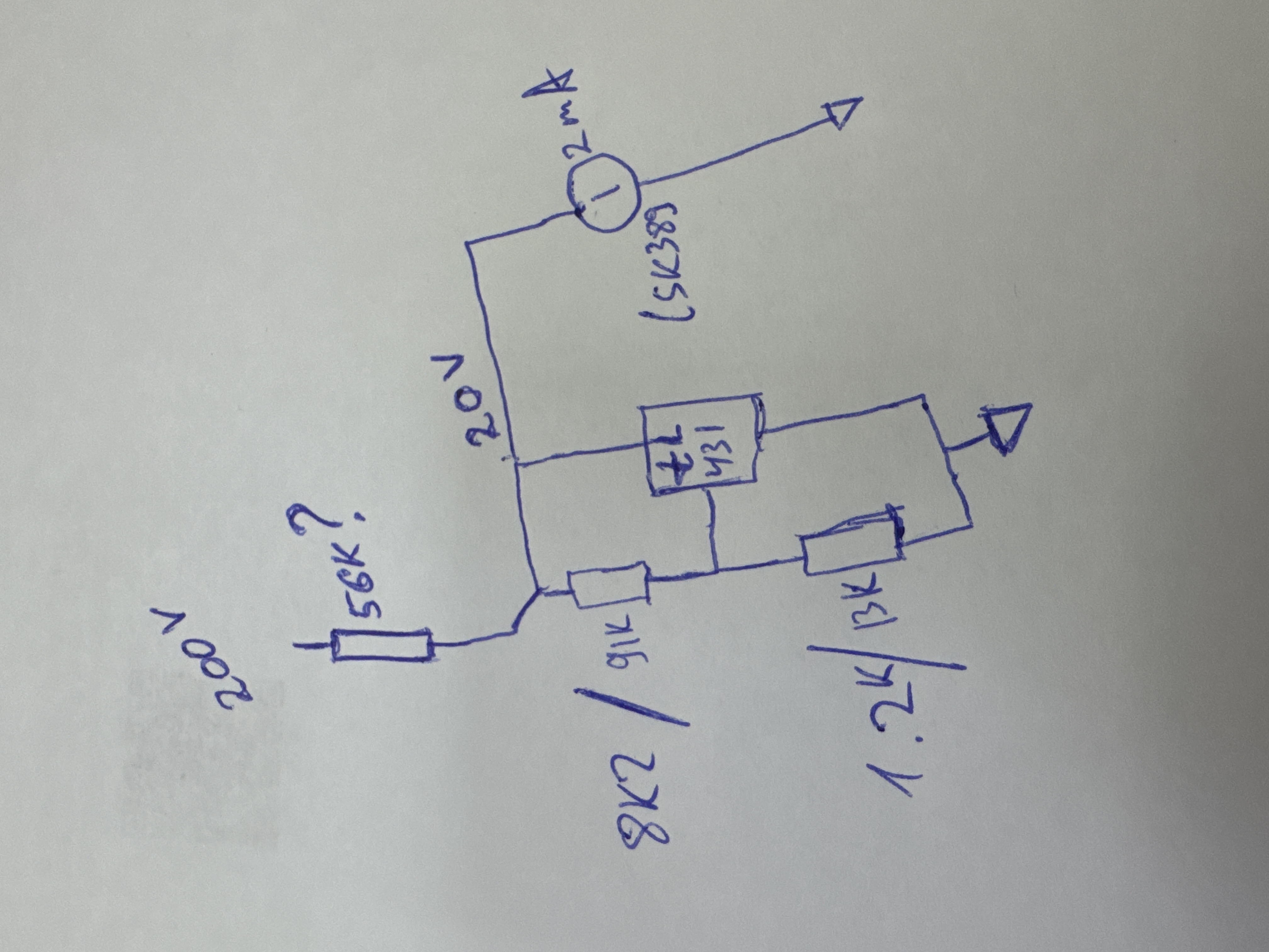 Ну например задаемся итого в 3мА. На 56к упадет 168в. Останеться 200-168=32В. Остатки в 12 вольт «сшунтирует» tl431.