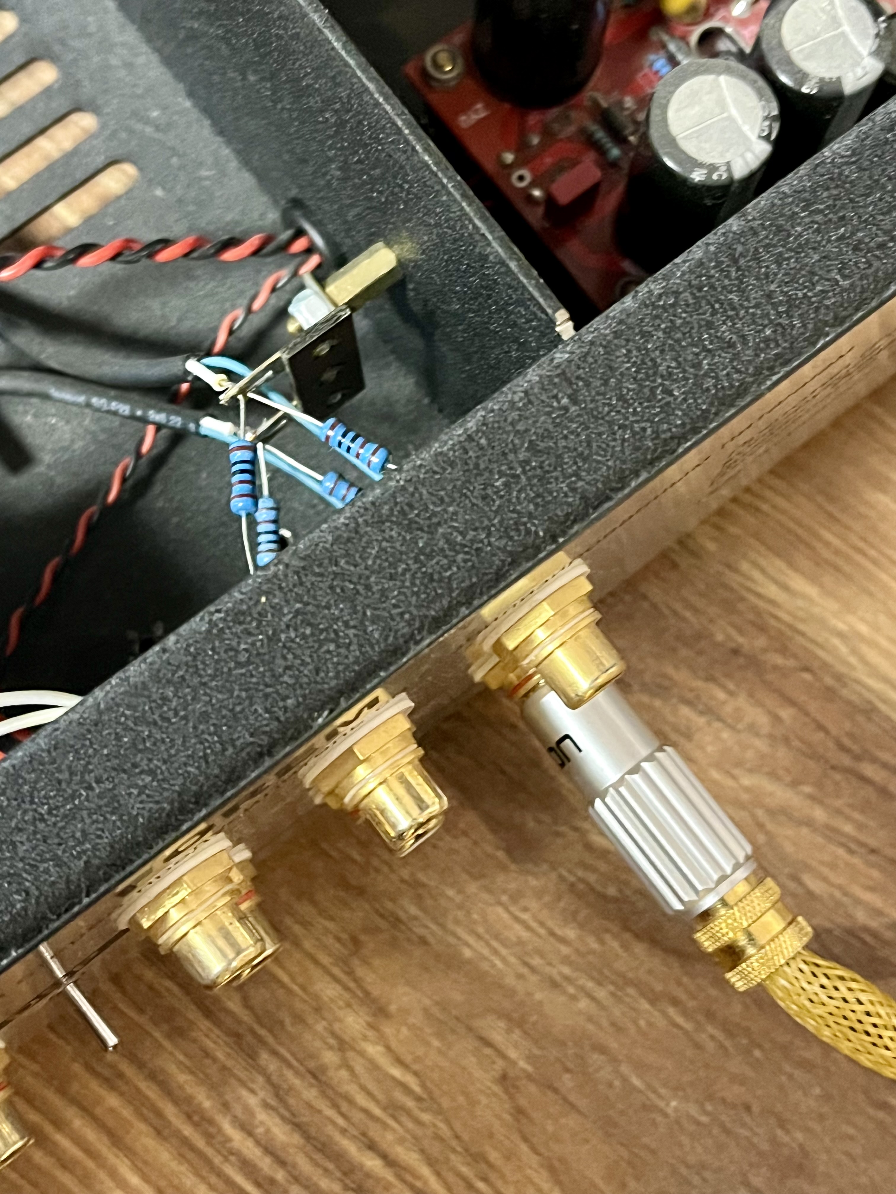 Грешу на окисление и ослабление гайки зажима земли с земляным лепестком и корпусом разъёма. Можно острыми щупами на одном проводе по закорачивать провод земли с корпусом разъёма и убедиться, что фон остается. Тогда моя идея мимо. Второй возможный косяк в этой конструкции- прозвонить земляные контакты разъёмов RCA с корпусом и убедиться, что контакта нет!