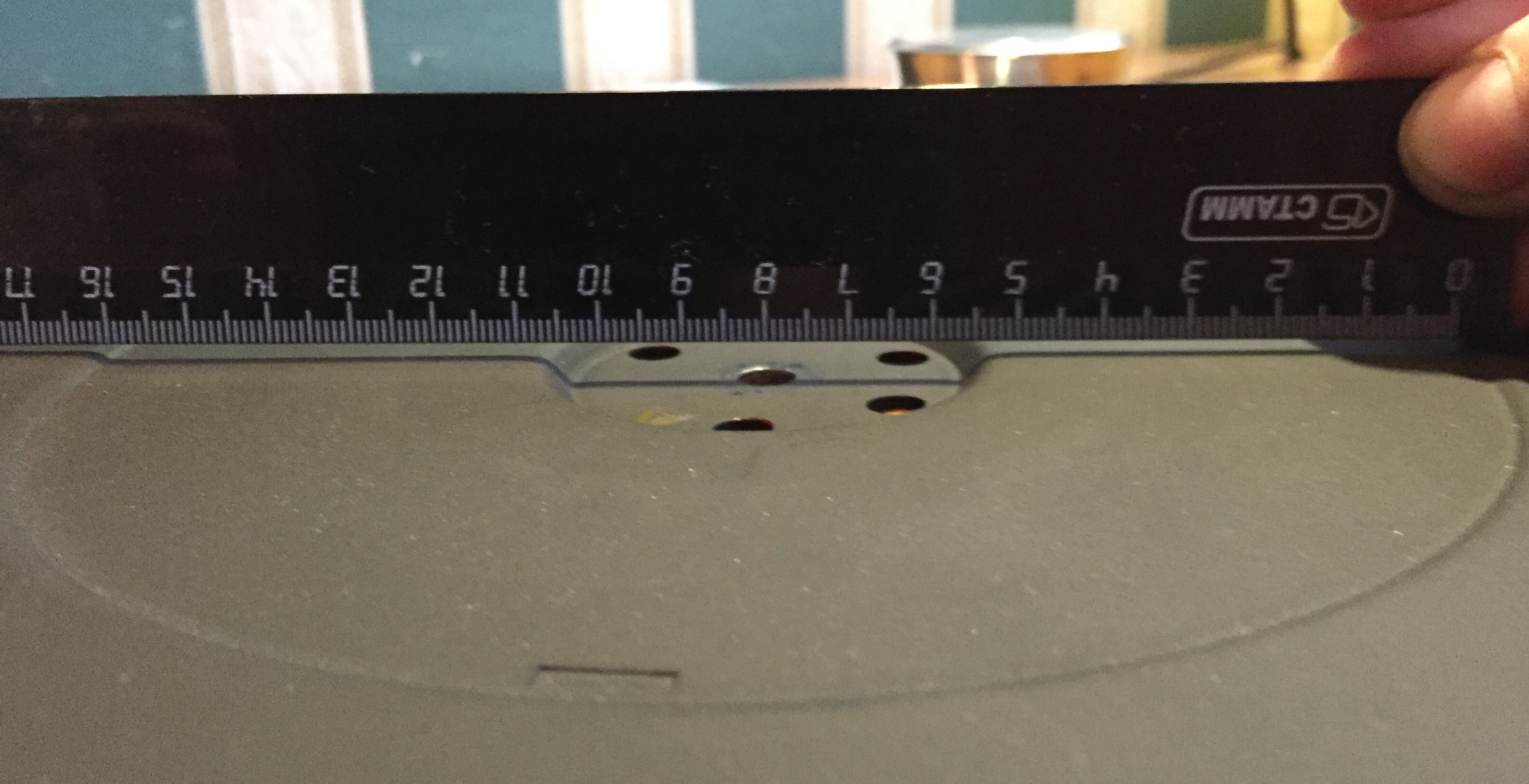Я измерил выступание бортика над центром диска привода (3,5 мм.). И зазор между центральной частью поворотного диска и этими выступами (2 мм.). Очевидно, что диск привода можно уменьшать до 1,5 мм. Если учесть измеренное биение, этого хватит с запасом.