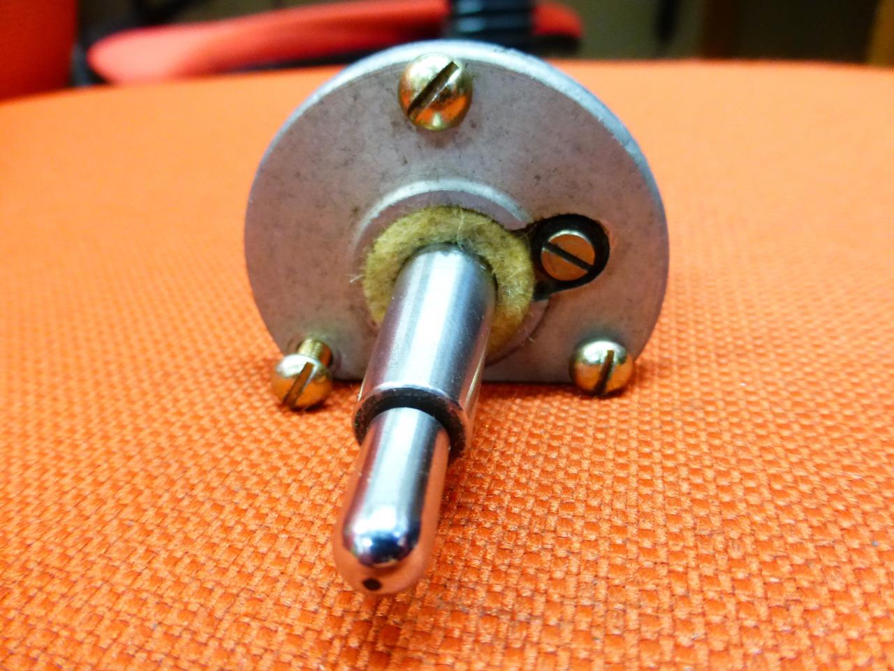Итак вал у меня. Стопор со старого вала снят (снимается легко, но имеет свойство отлетать в непредсказуемом направлении :sad: ). Идея состоит в том, чтобы закрепить корпус шпинделя на проигрывателе и только менять в нем валы.