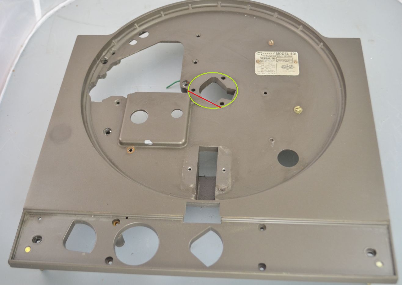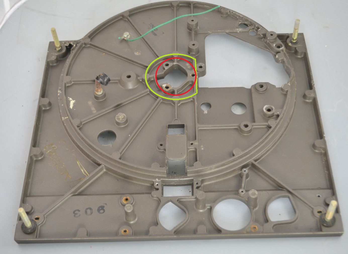 На этом же фото видно небольшой подъем под фланцем шпинделя. Я хотел подчеркнуть, что плато панели проигрывателя в этом месте не ровное.