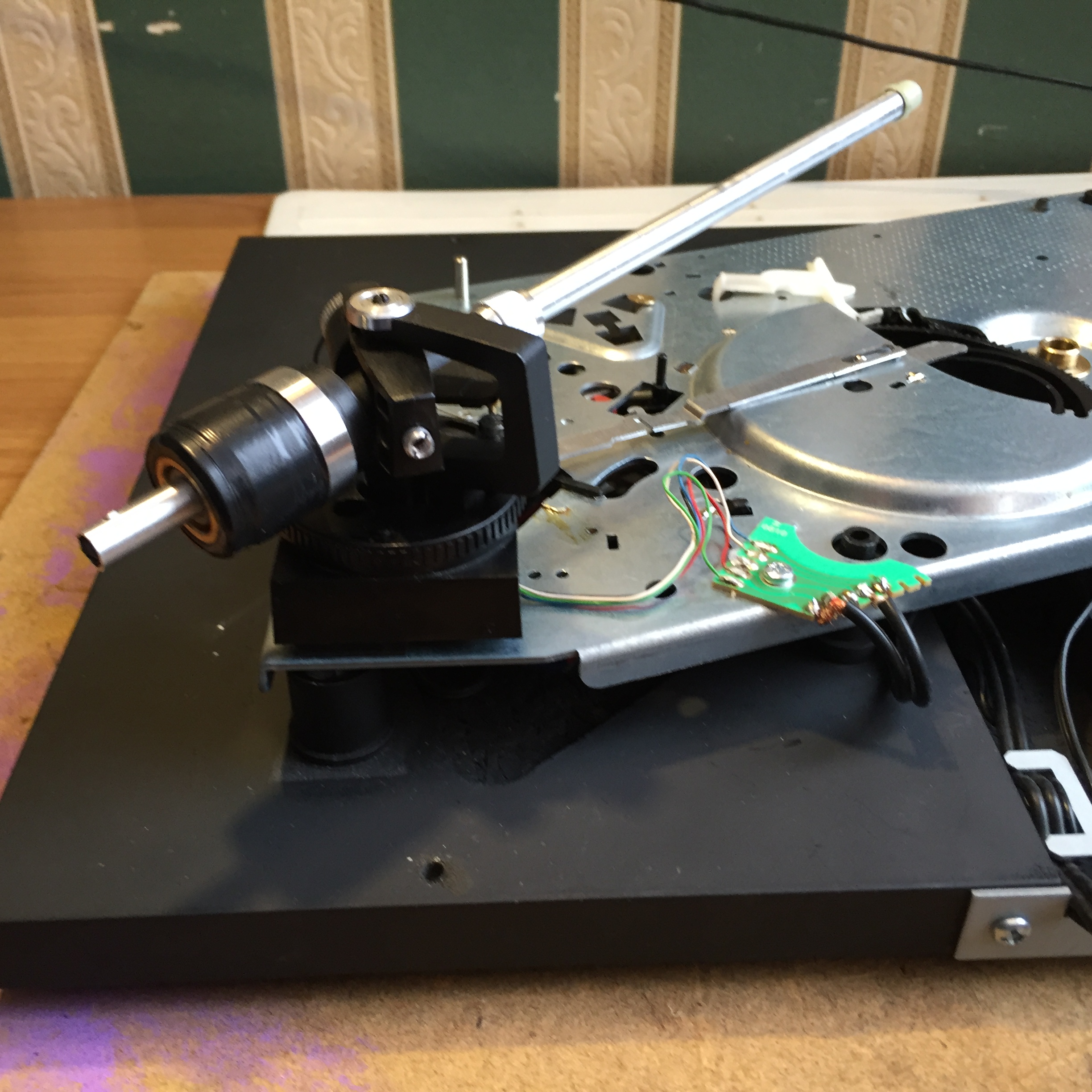 Увы, их пришлось снять! Именно из-за того, что я поднял тонарм, он потерял возможность управляться автоматом. Вот такая маленькая "штучка" теперь упирается в панель.