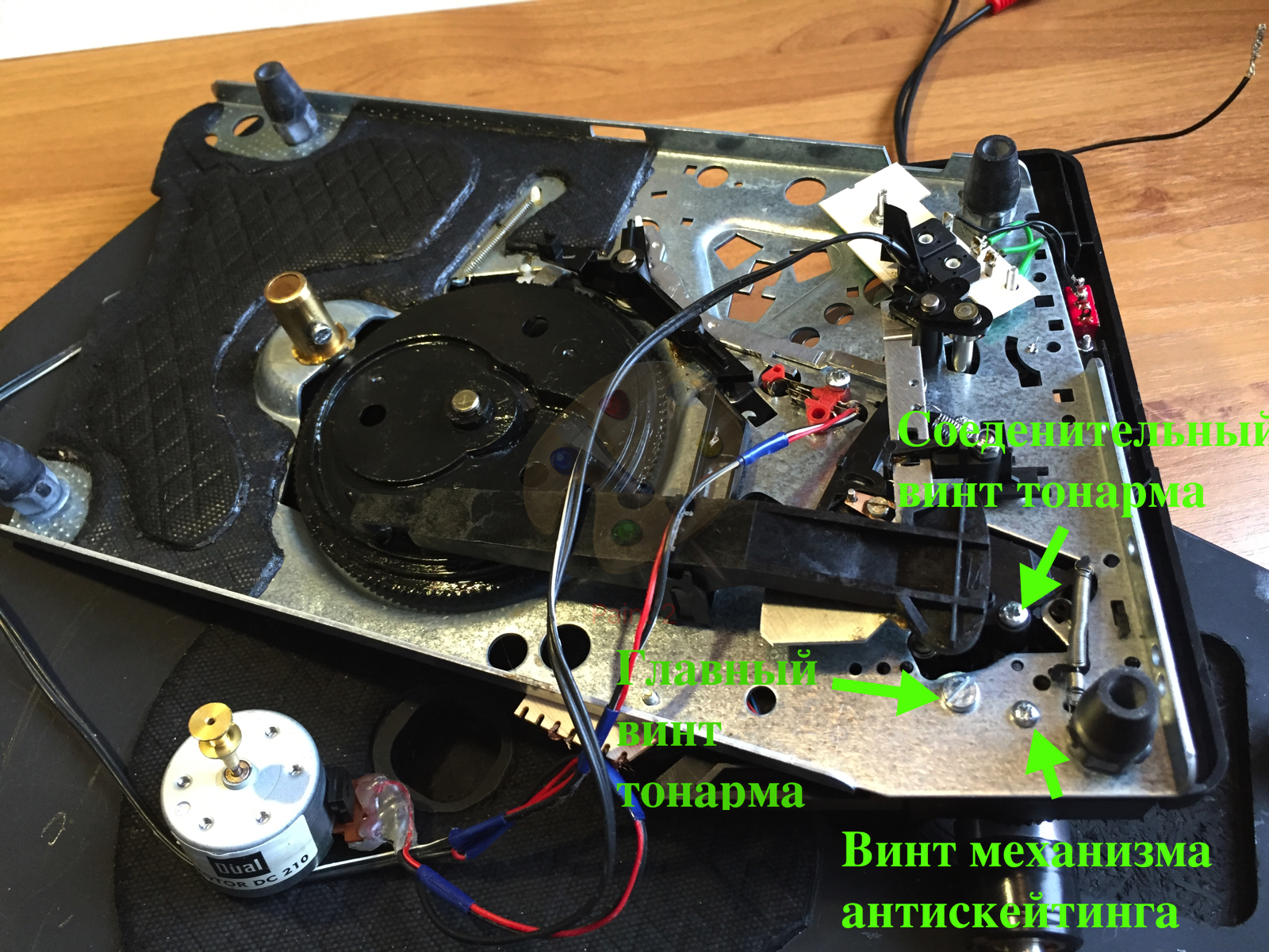 Наверное вы правы изделие действительно самодостаточное, я бы его и не ковырял, если бы тонарм на пластинке был "в горизонте". Хотя на столько примитивный стол должен стоить копейки. Даже подшипника нет под штоком. Тонарм весьма специфичный. Сильно влияет на звук верхний регулировочный винт. Чуть пережмешь подвижность тонарма ухудшается, недожмешь - люфт тонарма и призвуки. Тоже на слух регулировал.
