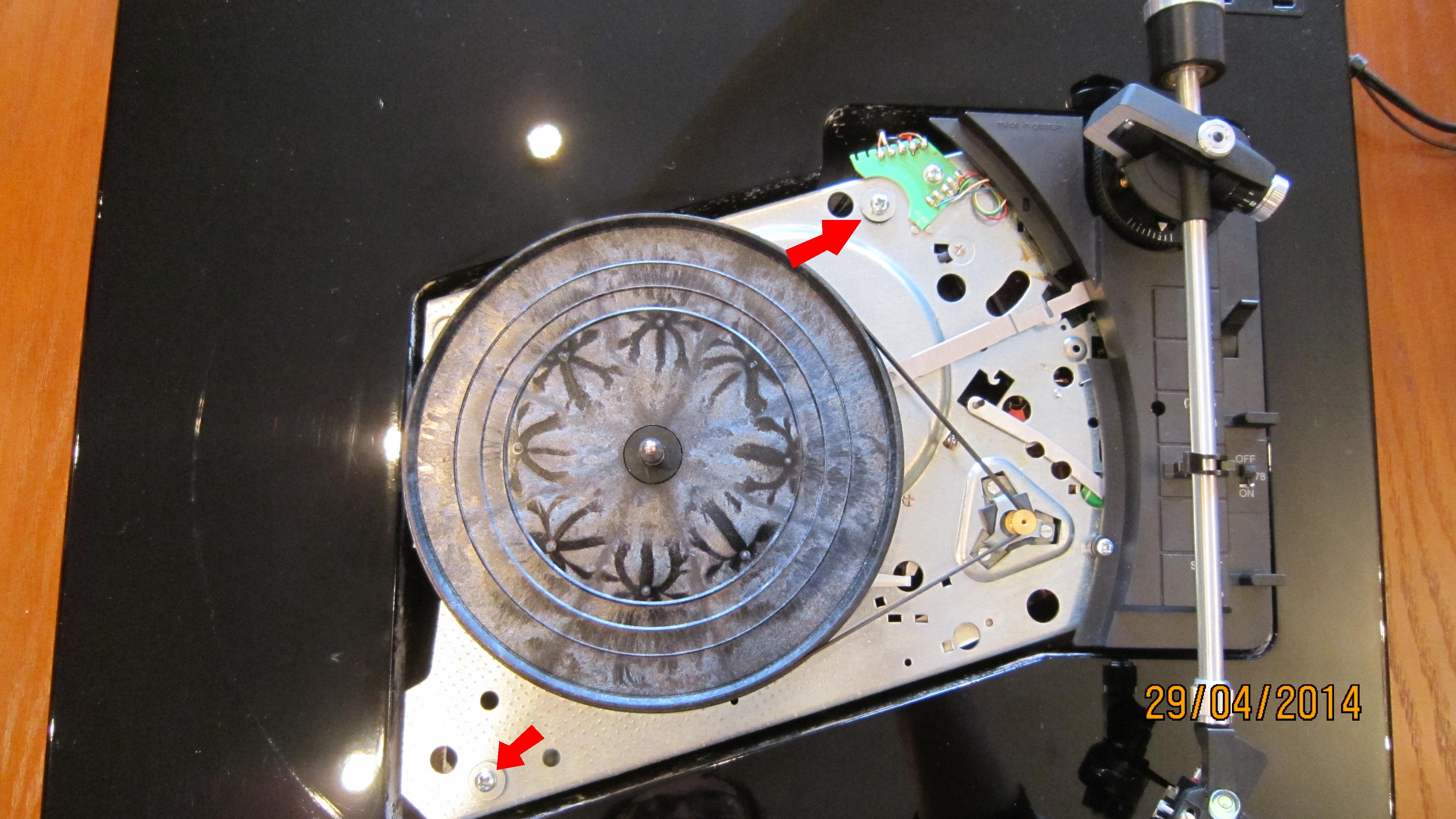 2) Дальше отворачиваем стопорные винты (иголку с картриджа лучше снять перед этими процедурами). 3) Шасси поднимаем и переворачиваем (как капот автомобиля). Я для этого на корпус всегда подкладываю сложенное несколько раз полотенце - дабы не повредить ни что. Я не помню какая там длина проводов, но по-моему она позволяет это сделать.