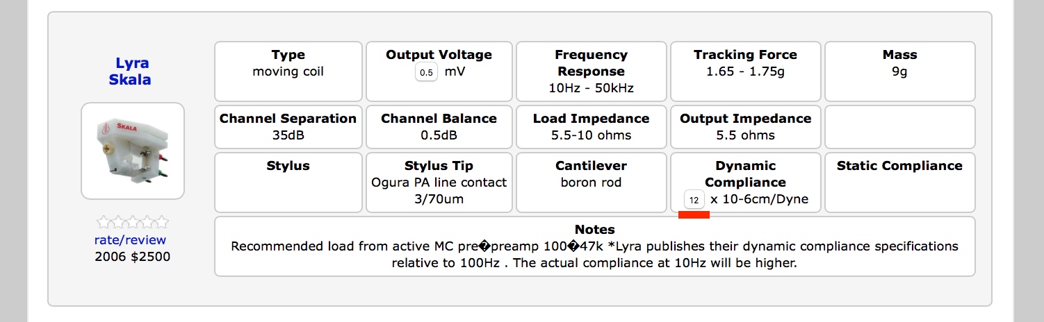Там отдельные вкладки по проигрывателям, тонармам и картриджам. Многие значения интерактивны в табличках. Например, те что выделил я. Нажимаешь на цифру обозначающую "податливость" и переходишь в окно с табличкой подходящих эффективных масс тонарма. Только там не всему можно слепо доверять. Данные по SME 3009 однажды меня сильно в тупик загнали. Пока Владислав не подсказал другой источник на тонарм.