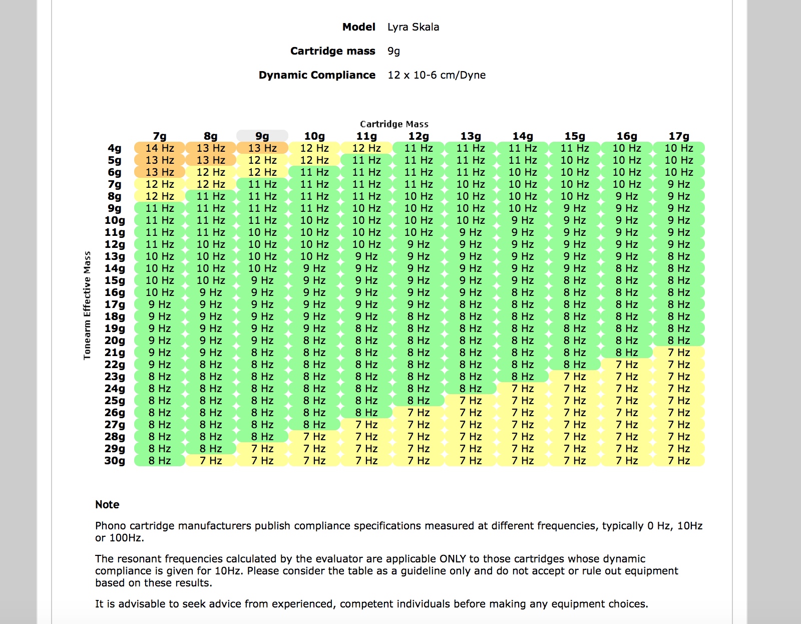 Подходящая масса тонарма в зеленой зоне. Среднее значение 18 гр. Но, надо сказать, что и Nima укладывается в диапазон, хоть и с краю. К тому же на Lyra (2-й скрин внизу) есть примечание по частоте измерения. Мол реальный параметр выше.