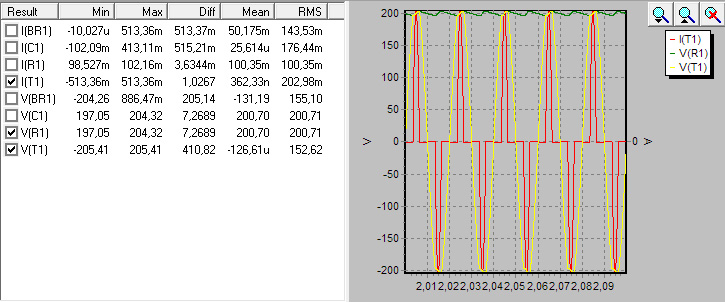 Видим, что выходное напряжение просело до 195,86В - и это определяется выходным сопротивлением системы трансформатор-мостовая схема выпрямления. При необходимости это сопротивление можно подсчитать, но мы сейчас этим заниматься не будем. Заметим также, что в контуре питания отсутствуют реактивные элементы (индуктивности и ёмкости) за исключением неучтённых паразитных, поэтому никакой частотной зависимости результатов не предполагается. Т.о., получаем , что относительное изменение напряжения примерно в 13 раз меньше относительного изменения тока. Повлиять на размер "пульсаций" в этой схеме мы не можем никак.
