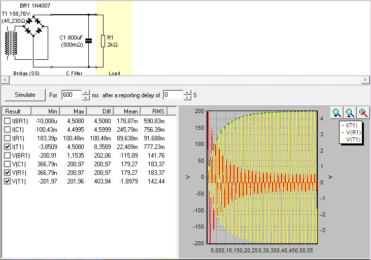 Используемый трансформатор: 197В@140мА. Здесь мы видим, что фильтрации нет, на выходе - примерно то напряжение, которое нам нужно (смотрим в колонку RMS строки V(R1)), ток, который нам нужен (I(R1)->RMS), но нас не устраивают параметры пульсаций (V(R1)diff=283,17В) и мы не знаем, как будет себя вести напряжение при изменении тока. PSUD2 Не позволяет проводить изменения в динамике, поэтому просто промоделируем тот же блок питания с нагрузкой, увеличенной на 30%: