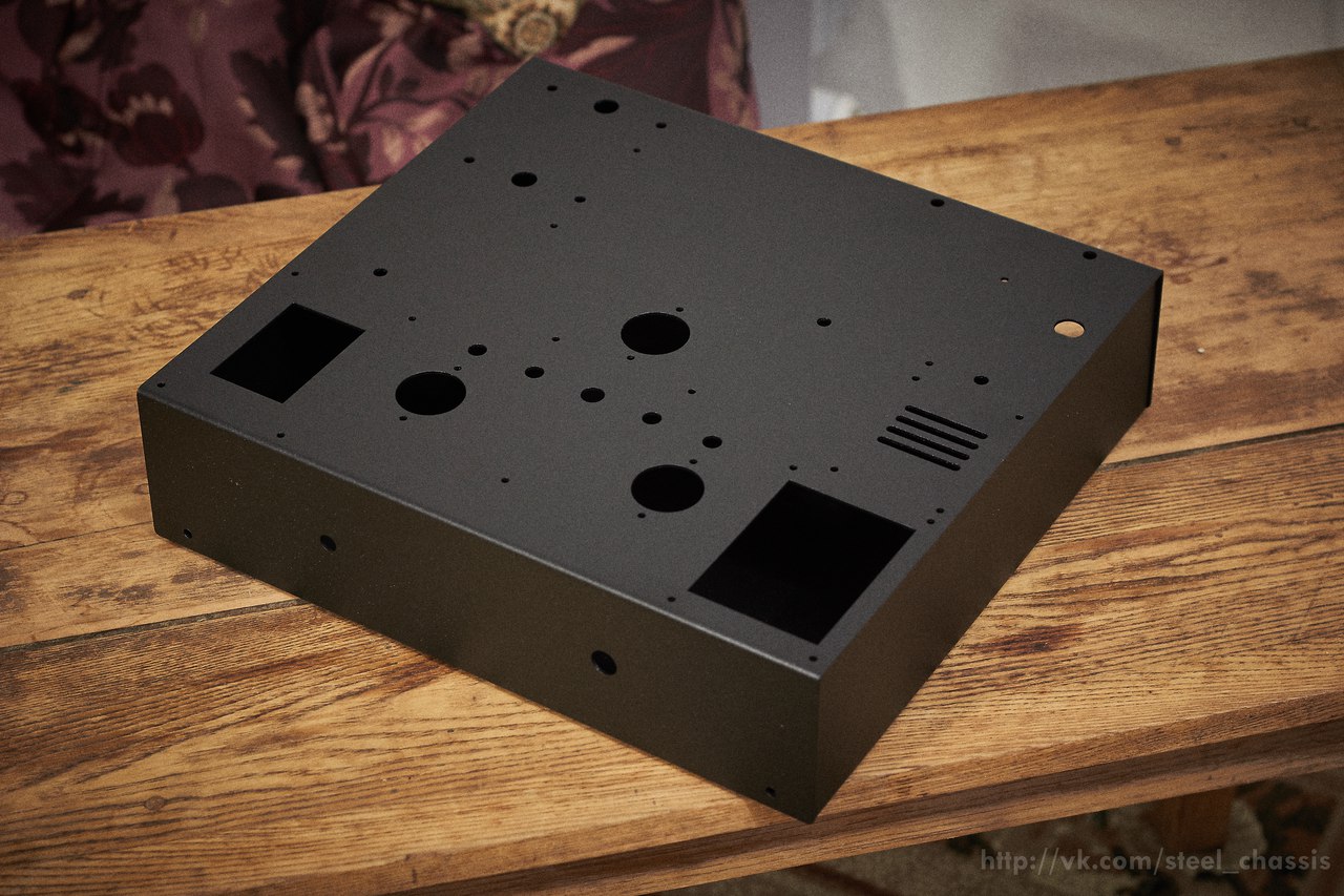 Есть корпус некоторой конструкции. Его можно быстро и относительно недорого заказать со всеми необходимыми отверстиями. Проблема в том, что этот корпус (его верхняя крышка) раскрывается вместе с передней и задней панелью. Так как и там и там будут штучки, к которым требуется тянуть провода, то нужно либо увеличивать их длину, либо крепить всё на верхнюю панель. Мне не нравится, когда верхняя или нижняя панели испещрены отверстиями, я предложил сделать внутри силовое шасси в виде пластины, на которое всё и будет крепиться, а затем уже эту пластину 4 винтами прикручивать к панели. Евгений изначально хотел прикручивать всё к панели вверх дном. Но так как у нас лампы, то я решил перестраховаться и поставить печатную плату с лампами как обычно, просто удлинив стойки от неё к силовому шасси. А в самом шасси на уровне ламп сделать либо большие отверстия, либо вентилляционные щели. В любом случае, на верхней панели неплохо бы предусмотреть вентиляцию какую-нибудь.