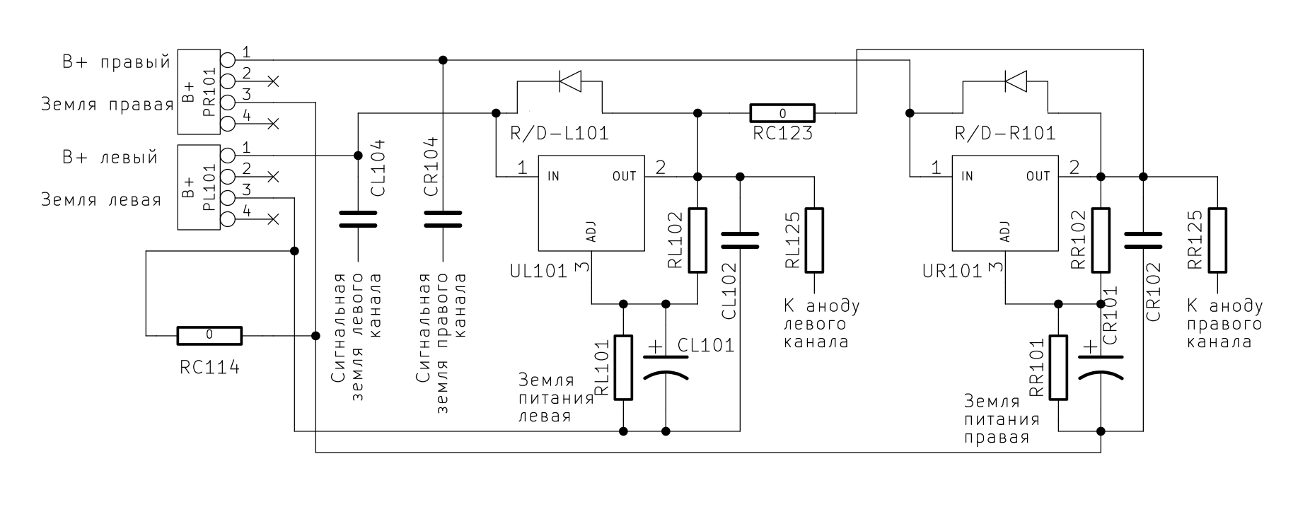 Выпрямленное, сглаженное и, возможно, стабилизированное напряжение подаётся на разъёмы PL103 и PR103 (отдельно для каждого канала). Положительный полюс подключается к контакту 1, отрицательный полюс - к контакту 3. На плате предусмотрено объединение земель питания с помощью перемычки RC114, как уже обсуждалось ранее.