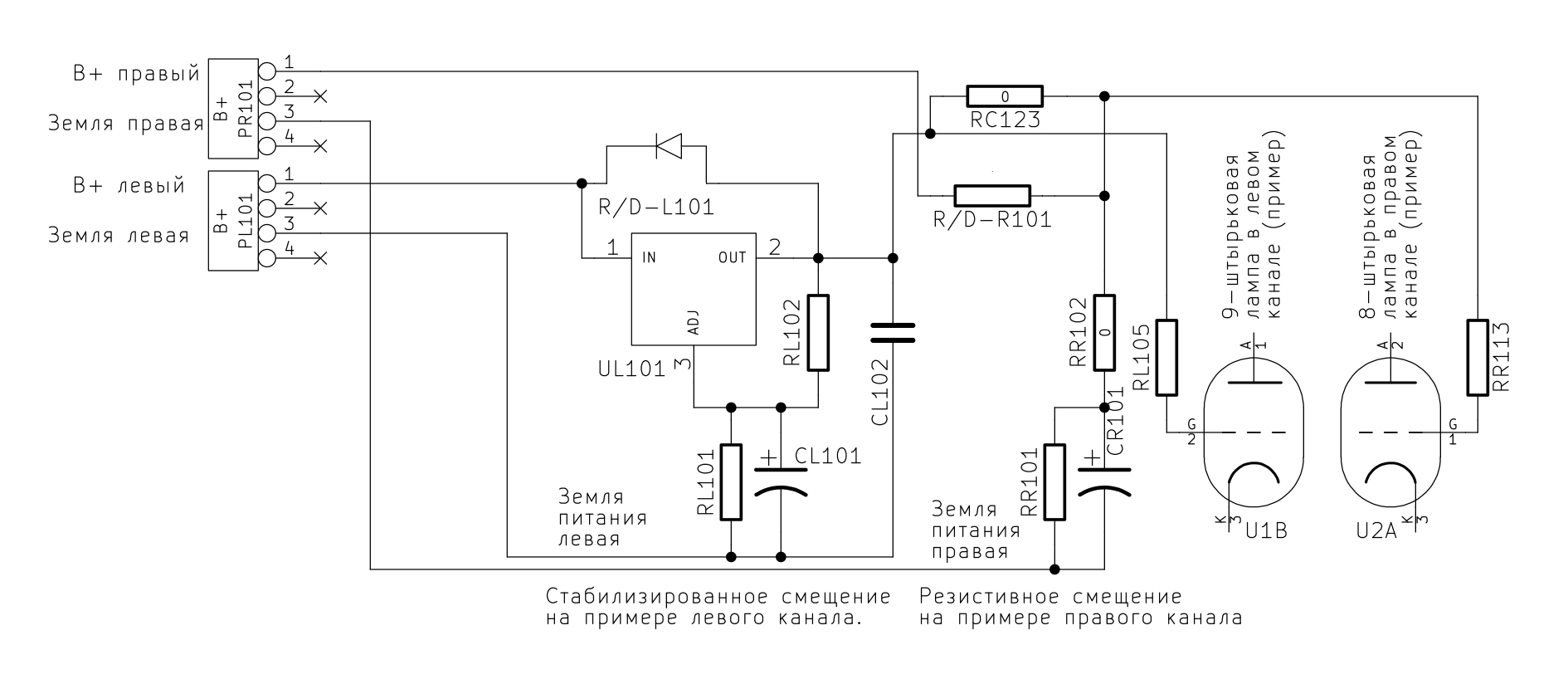 Цепи смещения R/D-L101, RL102, RL101 и R/D-R101, RR102, RR101 с соответствующими стабилизаторами UL101, UR101 и фильтрами CL101, CL102 и CR101, CR102 используются в некоторых топологиях (например, каскод) для организации смещения уровней верхних ламп (в каждом канале — своя схема смещения). Для балансных цепей можно использовать одну цепь смещения, с помощью перемычки RC123. В топологиях, где поддерживается автоматическое смещение верхней лампы, стабилизаторы можно использовать для анодного питания, при этом задействуются перемычки/сопротивления RL125, RR125.