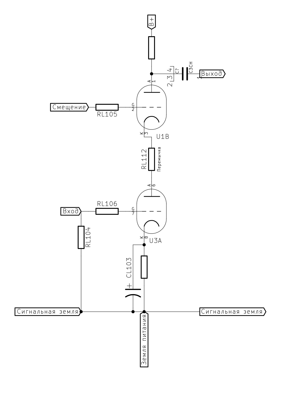 2. Цепи, помеченные "2" позволяют ввести в каскад общую обратную связь (и не обязательно отрицательную). Соотношение RL109, RL110 (RR109, RR110) определяет глубину обратной связи. Комбинация RL111, CL105 (RR111, CR105) позволяют ввести частотнозависимый элемент в обратную связь. Сигнал обратной связи подаётся на разъём P106 (отдельно для правого и левого каналов). Использование конденсатора CL103 (CR103) в данном варианте невозможно, поскольку он шунтирует катодную цепь и блокирует вводимую обратную связь.