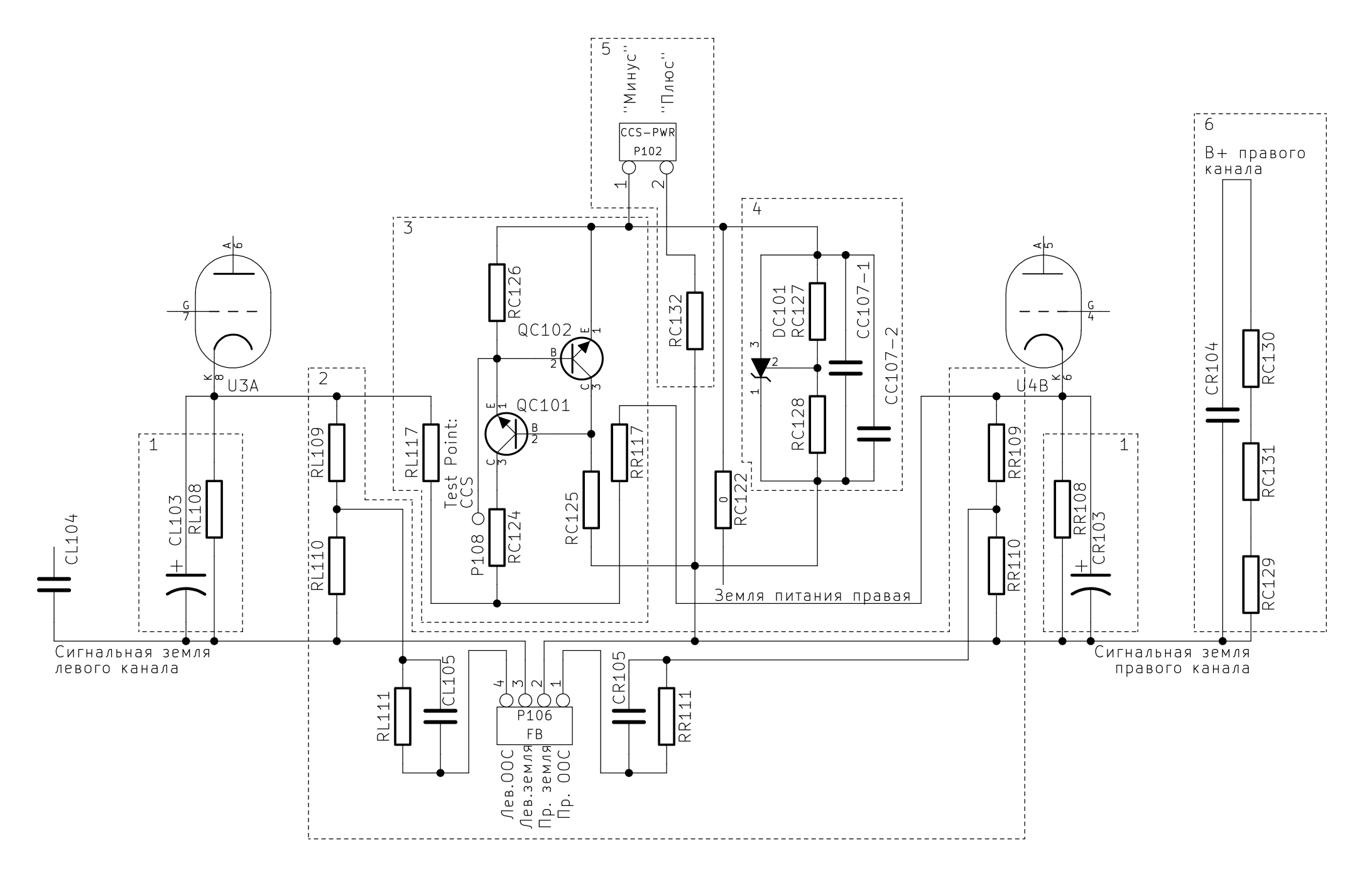 4. Источник тока для задания рабочей точки при использовании не в балансных вариантах. Соответствующие внешние источники тока для каналов подключаются к P106 (цепи "2"). RL109, RL111, RR109, RR111 заменяются перемычками. RL110, CL105, RR110, CR105 не используются. При этом обязательно использование CL103, CR103, в противном случае нижняя лампа будет работать в режиме катодного повторителя.