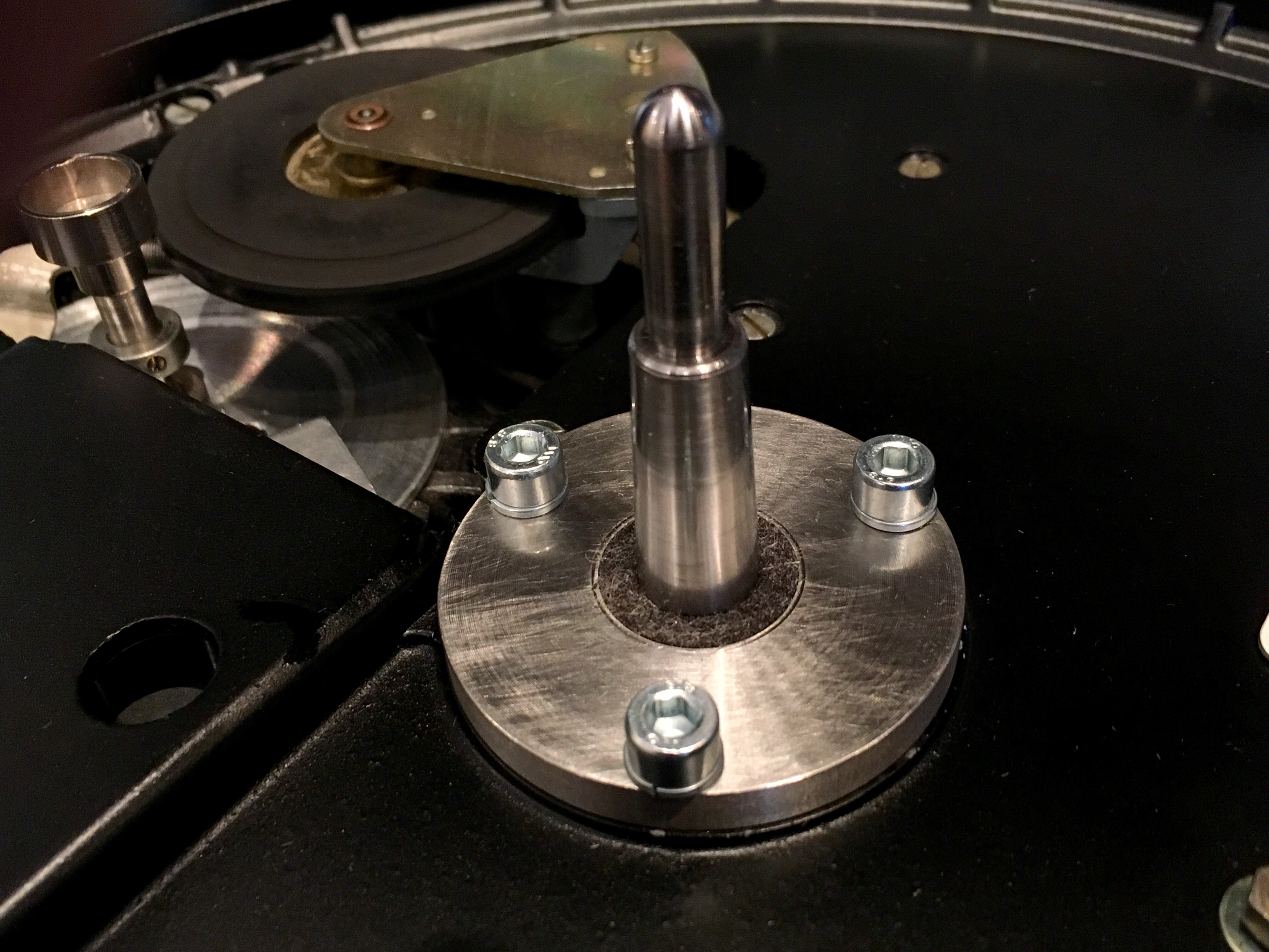 Шпиндель установил легко. Крепежная шайба - это стоящее ноу-хау. Я такого не встречал, но это существенно облегчает задачу. Буквально на раз-два. Винты выбрал те, что дал мне Ян. На мой взгляд они хорошо вписались в ландшавт, при этом очень крепко притянули корпус шпинделя к панели проигрывателя. Получилось очень жестко. Ни малейших шансов прогибам в этом месте.