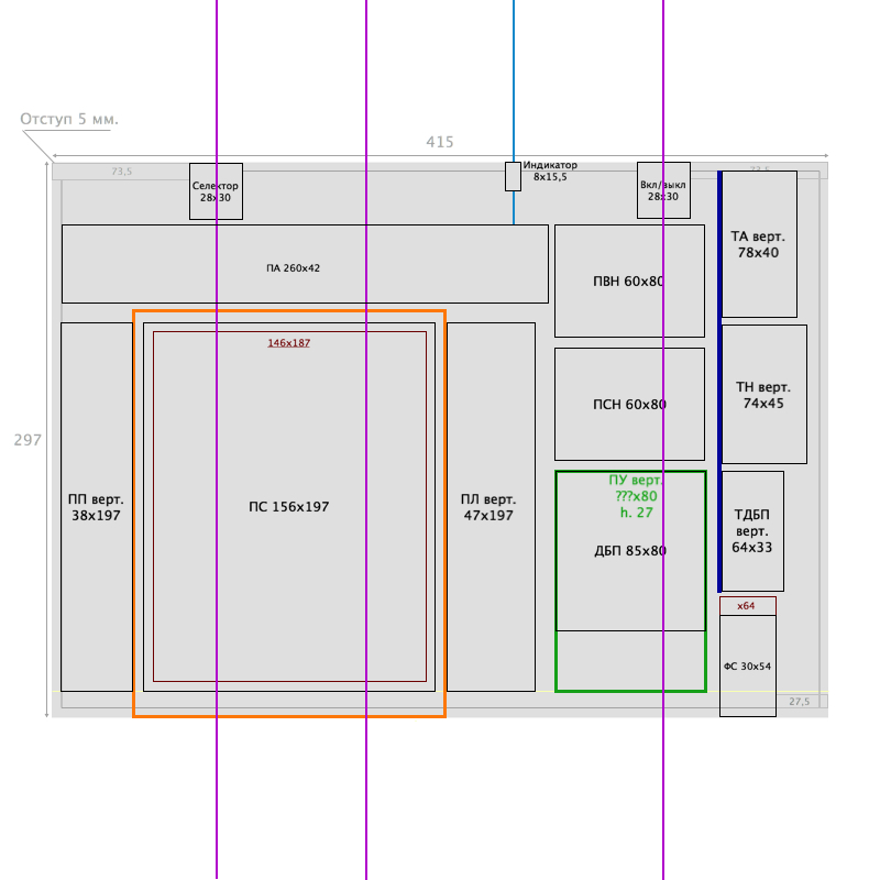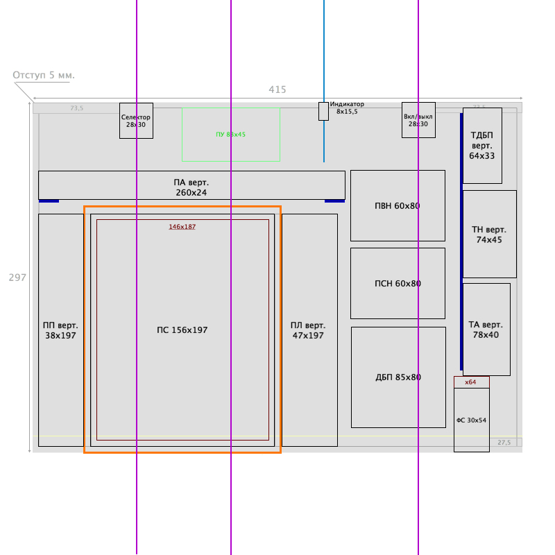 - Фиолетовые вертикальные линии обозначают центры ручек управления. По этим линиям шириной 40 мм. будут идти перфорации (аналогично корпусу предусилителя).;