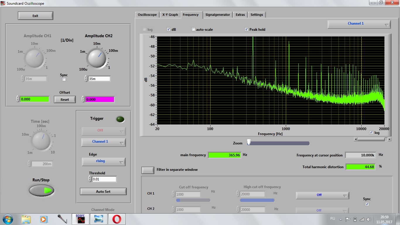 Результат получился интересный (на мой взгляд). Поэтому, я продублировал измерения при другом масштабе шкалы.poty писал(а):Чтобы снять многие вопросы, я бы также запитал Piccolo от аккумулятора и подключил его тупо к ноутбуку, работающему от батарей. Здесь мы вообще всё от земли розетки отрываем!