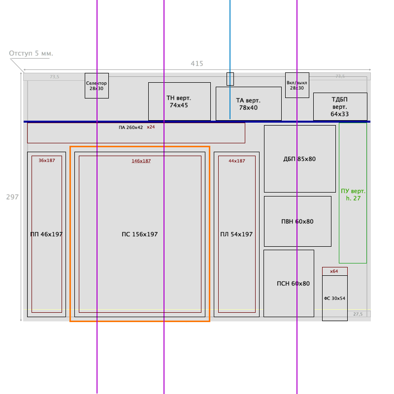 - Фиолетовые вертикальные линии обозначают центры ручек управления. По этим линиям шириной 40 мм. будут идти перфорации (аналогично корпусу предусилителя).;