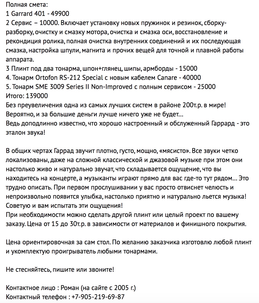 Я понимаю отсылки к старости этих проигрывателей. Но и Вы должны понять, что Ваш сервис серьёзно проигрывает по сравнению с "неспециалистским" сервисом того же Яна. Жалко, что много сообщений в ветке были удалены, хоть я и понимаю, что там много было мусора, но они показывали всю дотошность, с которой Ян подходил к этому проекту! И, простите, ВСЯ информация об этом ЕДИНИЧНОМ случае у Яна сохранилась в полном объёме: кто, когда, что и как делал, по каким чертежам, какие проблемы и проч. Что мы видим в данном случае? "Насколько я помню", "наверное", "забыл", "не успел" и т.д. И это - тот сервис, который Вы продаёте, как авторский и профессиональный.
