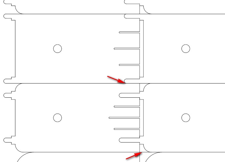 Эта линия исключает "заход", т.е., лазер просто прорезает всю ширину листа, не останавливаясь на каждом элементе (их 12 шт. по длине, а всего - 72 шт.). Остальные линии прорезаются при проработке вертикальных элементов.