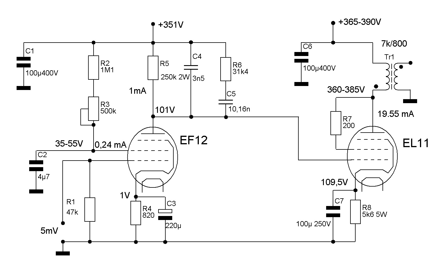 Нынче 351V! А резистор анода R5 250 кОм вместе с анодным напряжением ( 250/351 V) участвует в расчете RIIA, если я правильно смотрел теорию расчета.