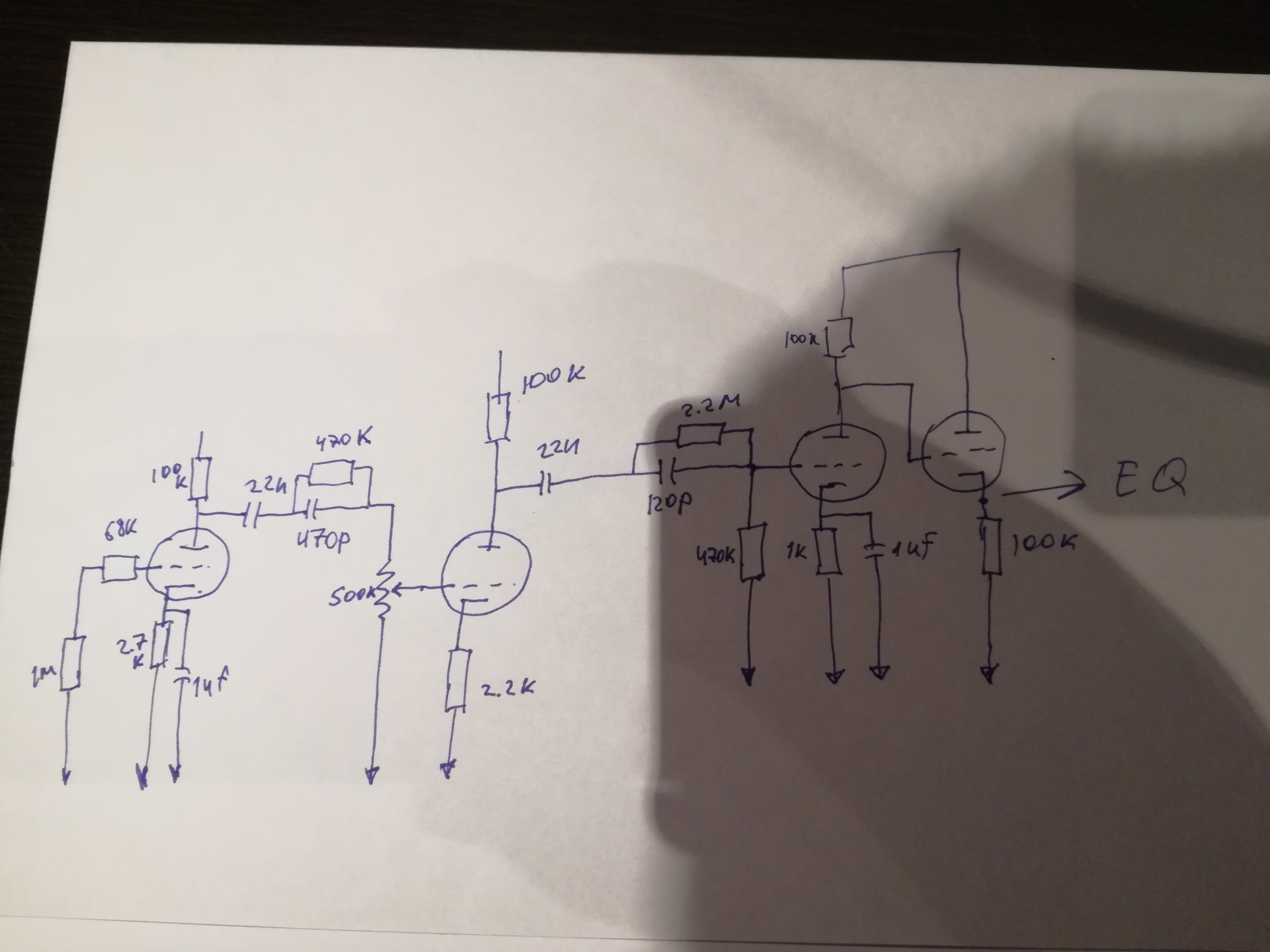 Можно! И эта идея мне нравится, я ее нарисую себе для полного понимания. Но примерно понимаю, о чем Вы. Если Вам по ходу бросаются в глаза некоторые моменты, сразу пишите об этом. Я могу в своем глазу бревна не видеть, запросто.poty писал(а):Допустим, выход второго каскада можно было бы взять не с конденсатора 22нФ, а с сетки третьего каскада. При этом цепочка 470пФ||470кОм + 470кОм стала бы частью добавленного (третьего) каскада - вместо сопротивления 4,7МОм - и выход бы брался именно с неё. Для развязки сеток можно было бы поставить последовательно с ними резисторы в 100Ом (HiFi-шный трюк, может это как-то влияет на драйв - не знаю, теоретически можно вообще не ставить резисторы).