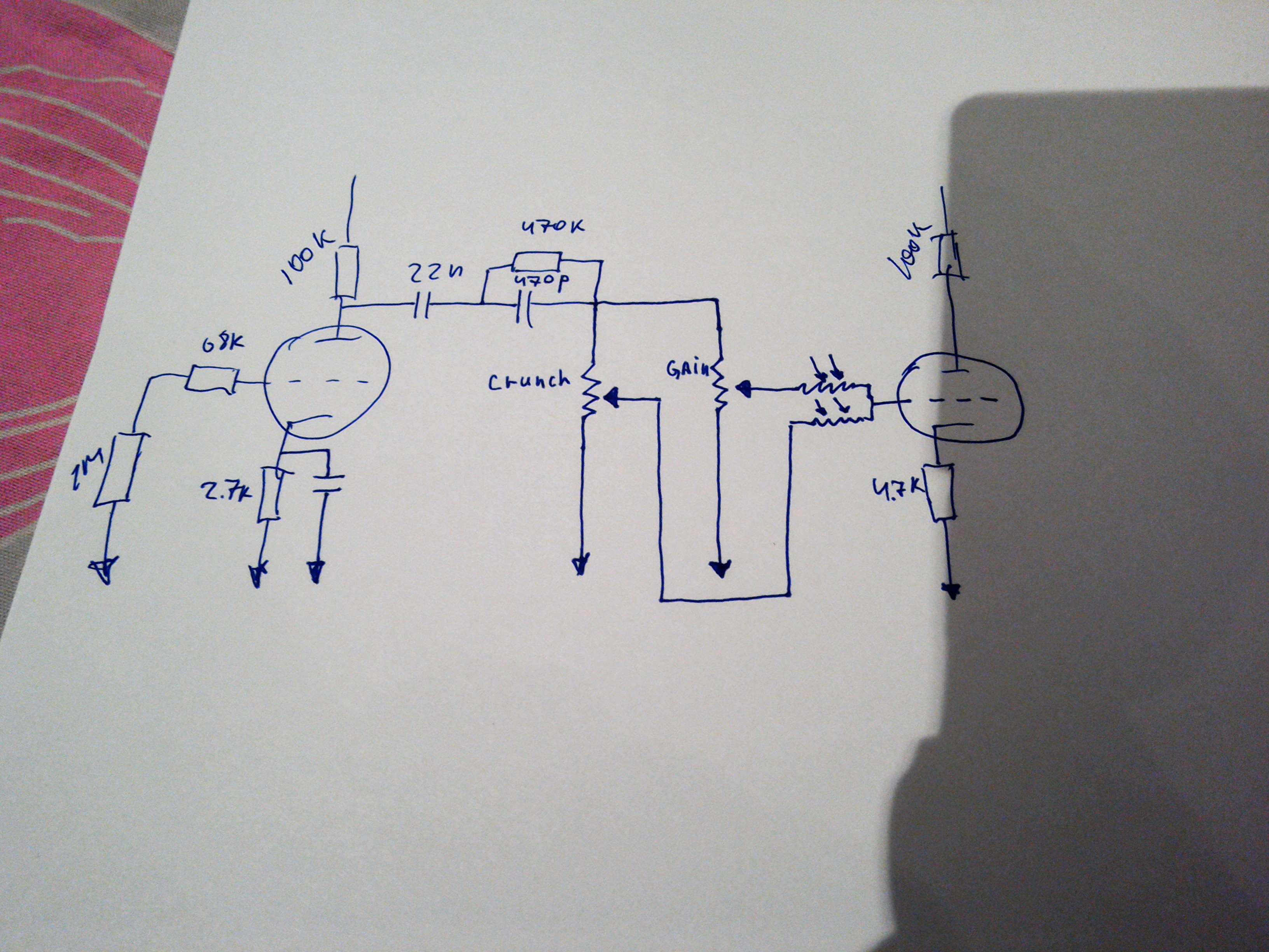 Мой рисунок на предыдущей странице от руки. После второй половинки идёт связка 22н - 470р/470к- 470к в землю. Так вот, я видел ставят 1мегаом резистор сразу после 22н в землю. Дальнейшая связка сохраняется. Я полагаю, это должно уменьшить нагрузку для второй половинки. Но работает ли это, как фильтр?
