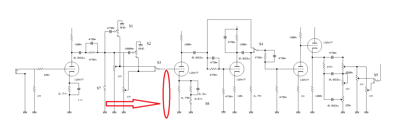 S3, S4, S5 - переключаются разом. Исполнение - ножной переключатель, можно (нужно) продублировать на лицевой панели. Это 2 разных характера перегруза, разделим их как овердрайв и дисторшн. В дисторшне у нас добавляется еще один триод. На каждый режим свои потенциометры Gain (два первых мегаомника) и Volume (после эквалайзера).