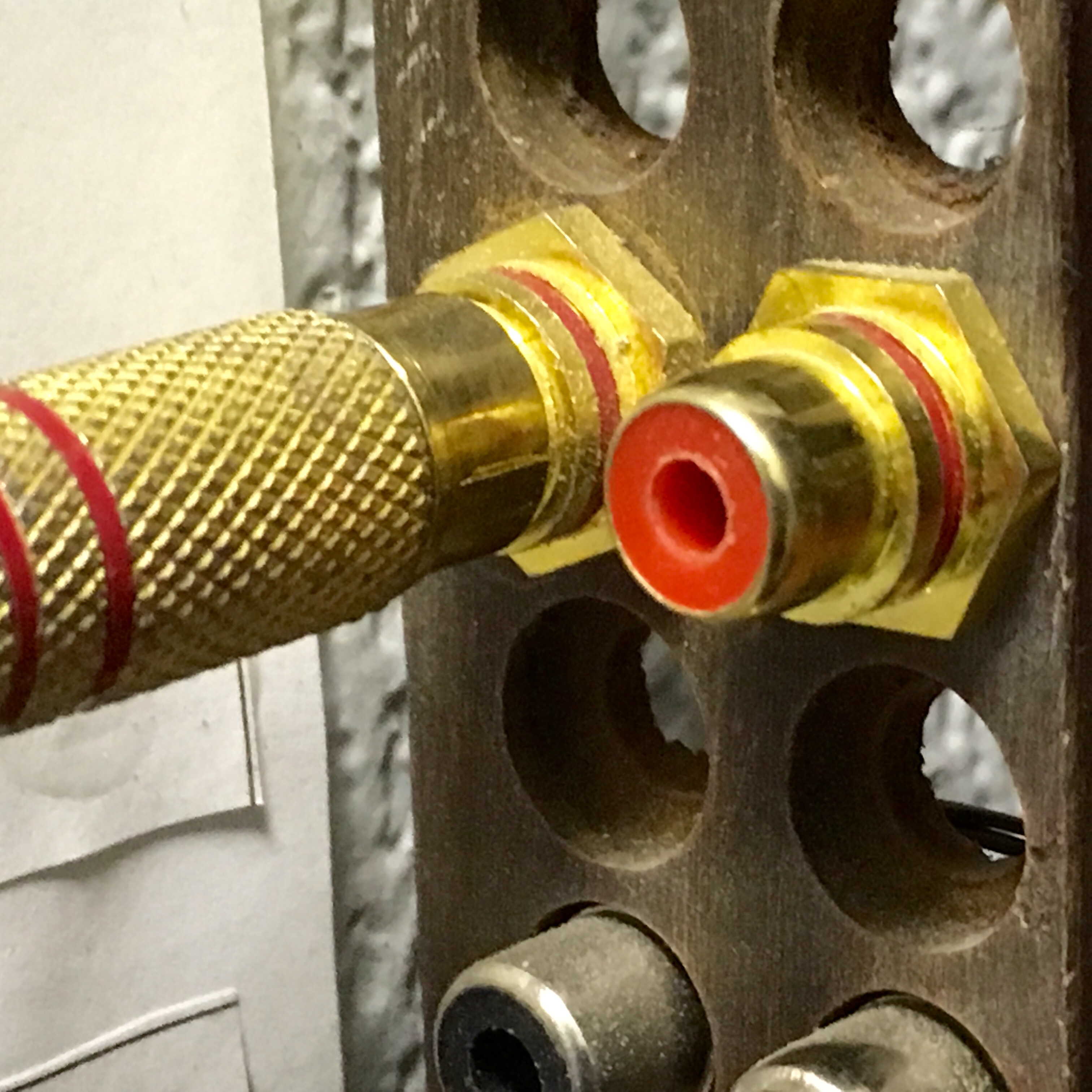 И подумал, что почему-то я позиционирую надписи на заднике относительно разметки отверстий. Но, RCA-гнезда моего усилителя меньше, чем отверстия под них, а как обстоит дело у нас? Ведь если разьем будет в нахлест, он накроет и часть надписи. Или по крайней мере, сместит центрирование.