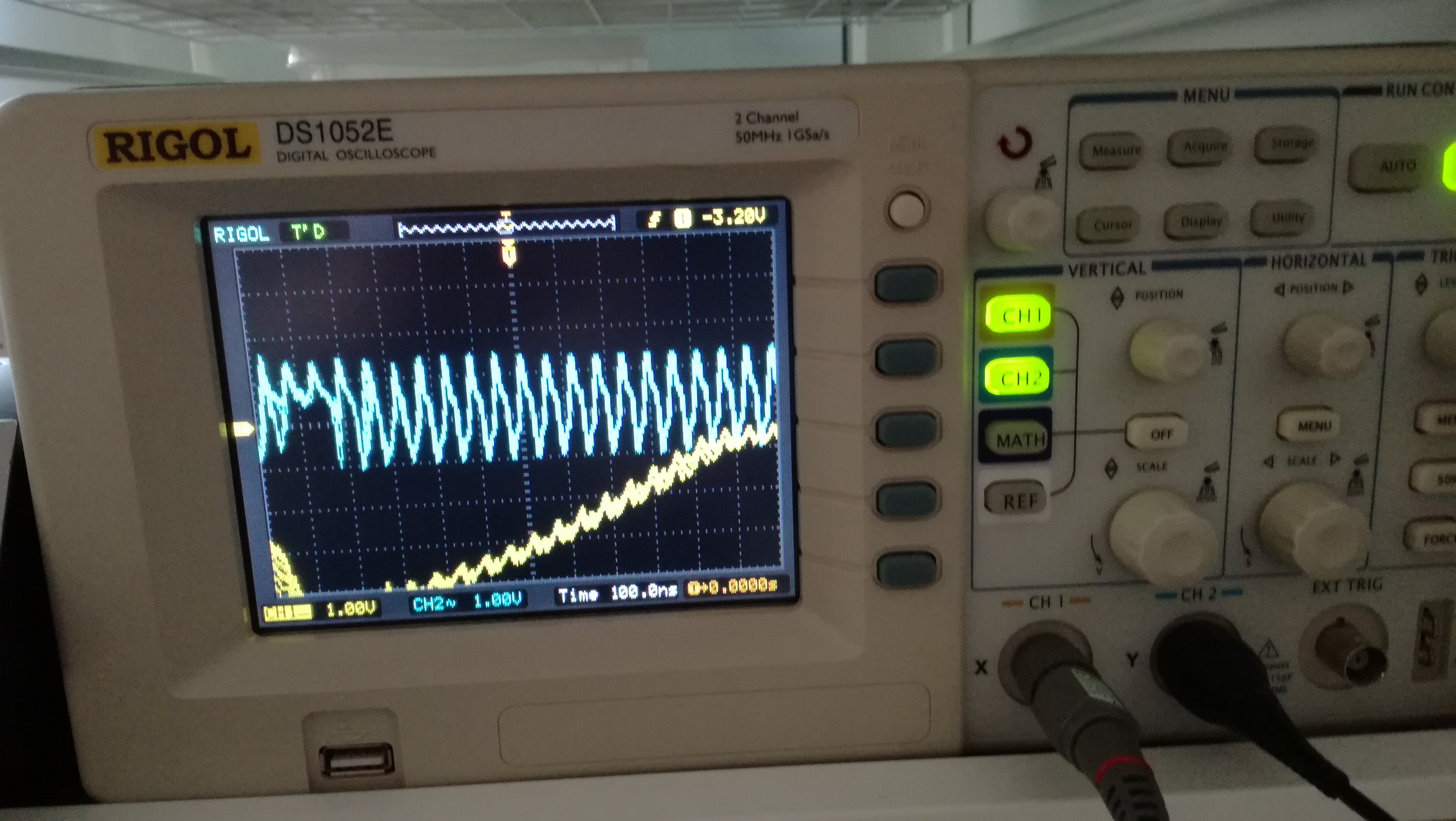 Евгений, Вы меня пугаете. То, что Вы видите не прямые линии, а синусоиду Вам ничего не говорит? Я насчитал 5 пиков на синей осциллограмме на расстоянии три клеточки (если брать от центральной вертикальной линии). Три клеточки - это 3х100нс= 300нс. Длительность одного периода получается 300/5=60нс. Частота сигнала обратно пропорциональна периоду 1/60нс=16,(6) МГц.