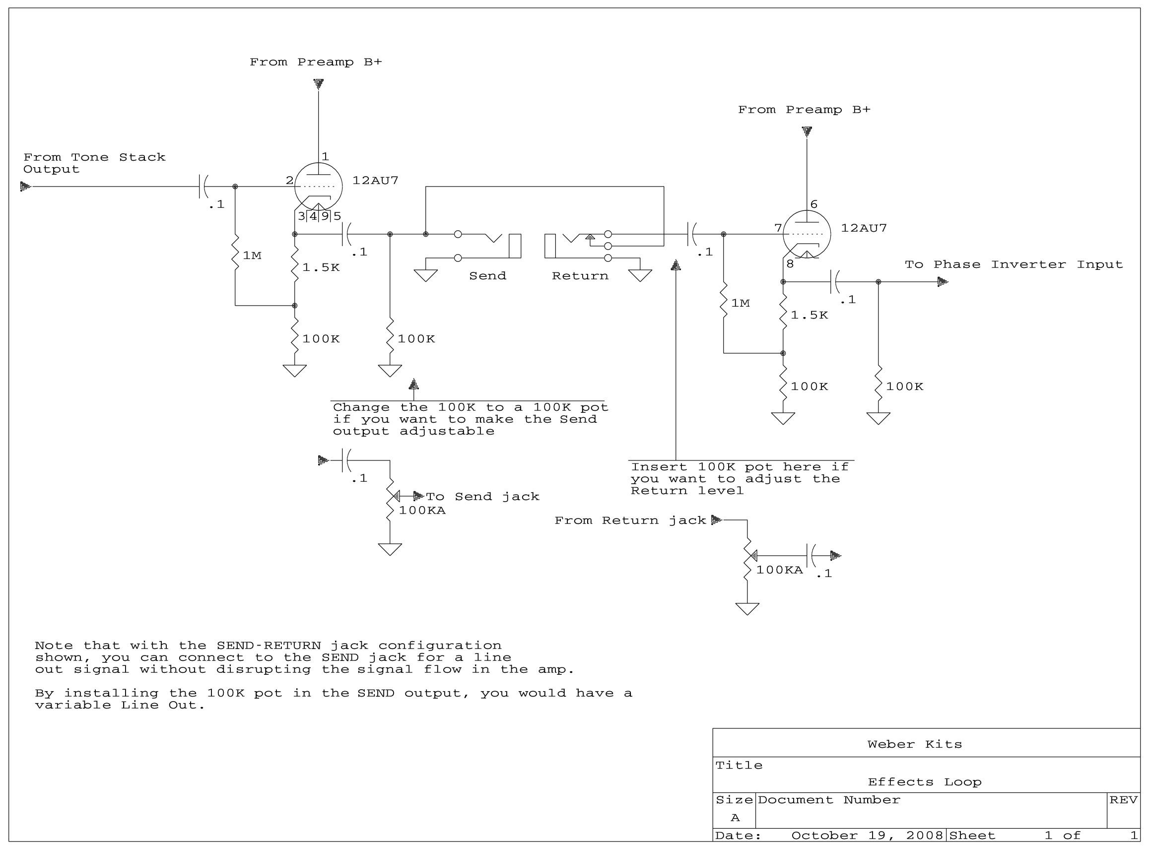 Этот вариант тоже будет работать и нравится мне гораздо больше тех вариантов, что были раньше (на лампах). Но! Опять потенциометр Send Level на выходе!!!! Зачем? Почему не на входе? Почему бы его не сделать единственным сопротивлением в катодной цепи (как альтернатива установке на входе)? Установка потенциометра на 250к делает выходное сопротивление сопоставимым с половиной его сопротивления в худшем случае!Евгений Михеев писал(а):Рабочий ламповый вариант на 12ax7 с комментариями