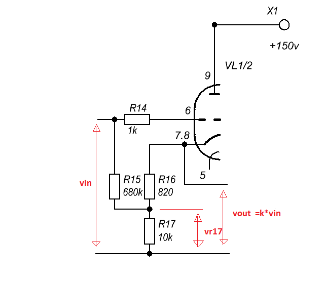 vr17=vout(R17/(R16+R17))=k*vin(R17/(R16+R17))