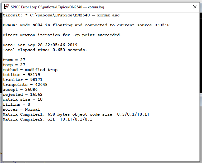 Скорее всего, надо цепь N004 соединить с землёй через резистор, допустим, 50МОм. Когда LTSpice пытается определить рабочую точку схем, он находит пути протекания тока для всех элементов. Если элемент представлен .subckt, LTSpice не может распознать откуда и куда потечёт ток, поэтому требует, чтобы был определён хотя бы один известный путь протекания, пусть он и такой, что ни на что не влияет.