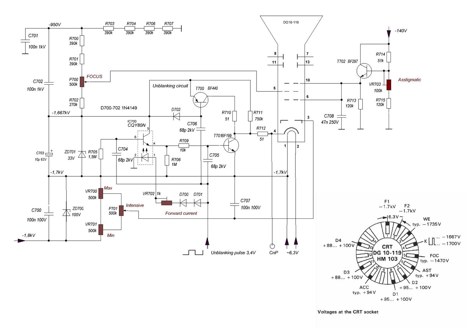 Не думаю, что это - проблема. А вот оптрон меня смущает. Его транзистор могло пробить и отсюда - утечки тока. Пытаюсь разобраться в работе. Если разбланкирующего импульса нет, то транзистор оптрона IC700 получается закрыт (и эмиттер, и база - подключены к минусу питания), T701 закрыт потому, что тока через IC700 не течёт, напряжения на базе Т701 нет. Т700 закрыт (отсутствует смещение на базе). Фактически, катод подключен через R712+R711 к -1,667кВ. На сетке - от -1,7кВ до -1,8кВ.