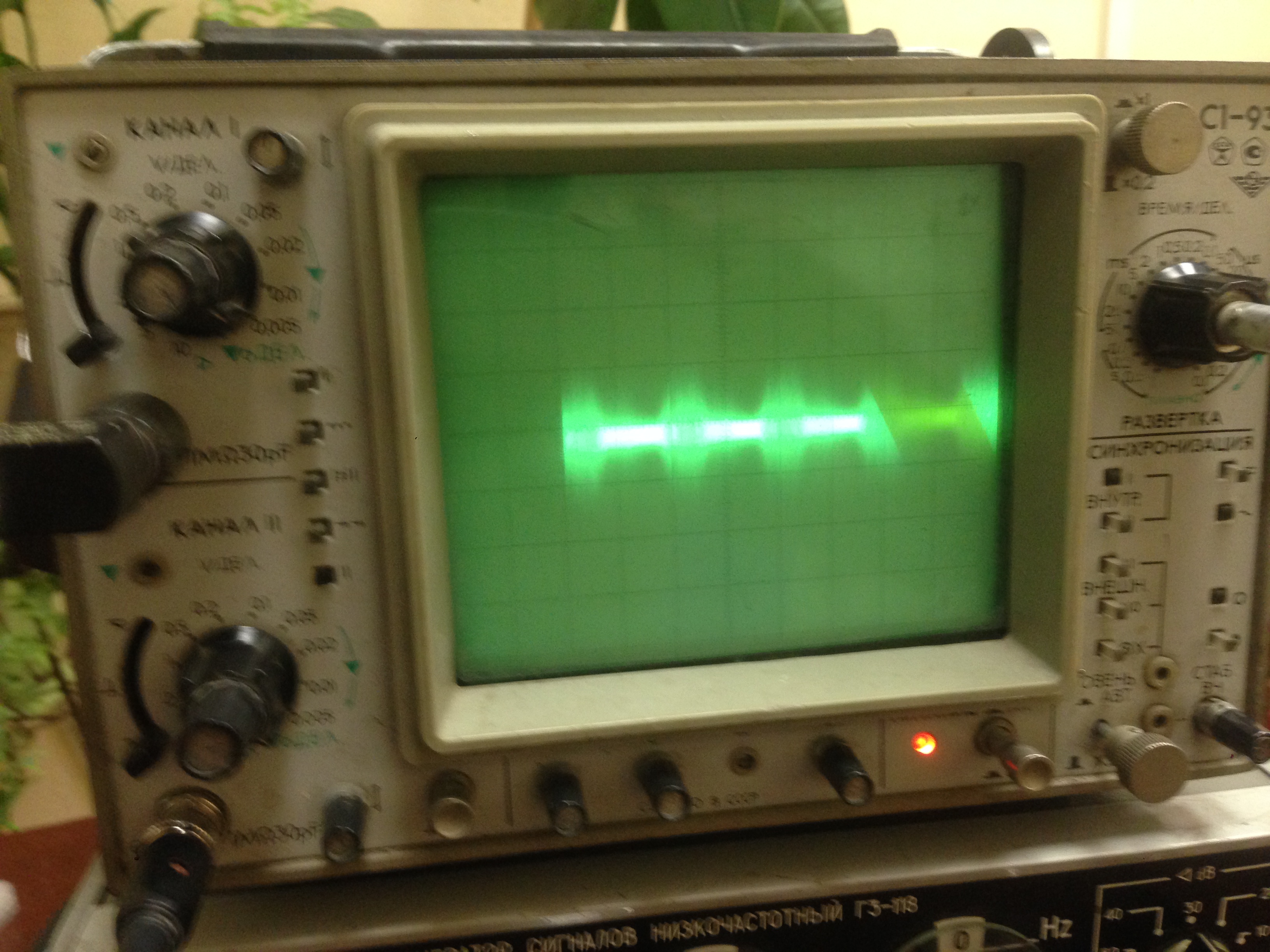 Видно, что на фоне неубиваемой ВЧ помехи, модулированной 100 Гц огибающей, есть еще какие-то "пики". Именно эти пички и дают "зуд". При выдергивании из сети 220В вилки блока анодного питания "зуд" тут же пропадает. На следующем фото видно, что при этом выдергивании пропадают только пички, ВЧ наводка остается ( или она у осциллографа на щупе сидит, а не в схеме, трудно сказать однозначно). На анодных конденсаторах схема ещё секунд 15 выдает чистейший звук без всякого фона и зуда. От уровня полезного сигнала зуд не зависит, всегда одной величины.