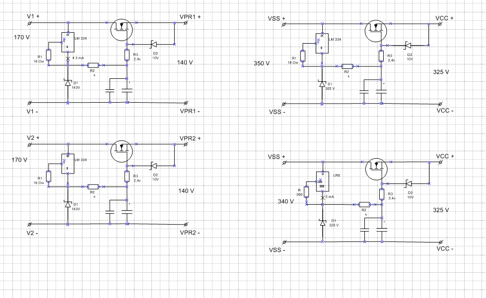 Второе замечание - по поводу LM334. Замечаю за собой особенность, что много размышлений оказывается не раскрыто и вопросы поэтому кажутся не очень важными. Когда я задавал вопрос про резисторы от стабилитрона на затвор, я имел в виду, что именно они будут работать как ограничители первичного броска напряжения при включении. Поясню: при включении напряжение на затворных конденсаторах будет = 0, напряжение на LM334 будет в теории определяться только падением напряжения на вышеуказанных резисторах при заданном токе источника тока. Например, при токе 4мА, на резисторе 22кОм будет всего 88В! Остальное напряжение окажется на LM334. В связи с этим считаю более правильным применить LND150. При том же количестве элементов (или даже меньшем, поскольку Idss позволяет избавиться от токозадающего резистора) получаем возможность использования напряжения до 500В и нормальный ток в 1-3мА (я не знаю зачем Вы планируете такие большие токи через стабилитроны, они высоковольтные и явно будут греться при таких рассеиваемых мощностях).