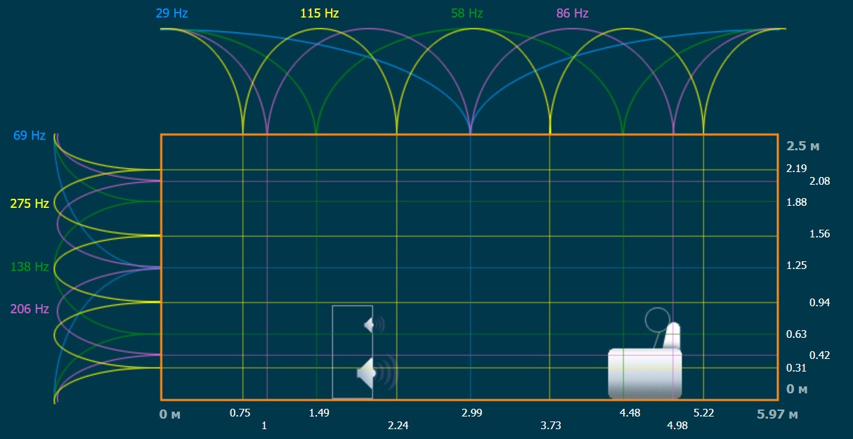 Я согласен с Владиславом на счет моды 69Hz, например. Но, почему она так влияет... и почему гасит, а не усиливает... почему диван, это влияние ослабил... ???