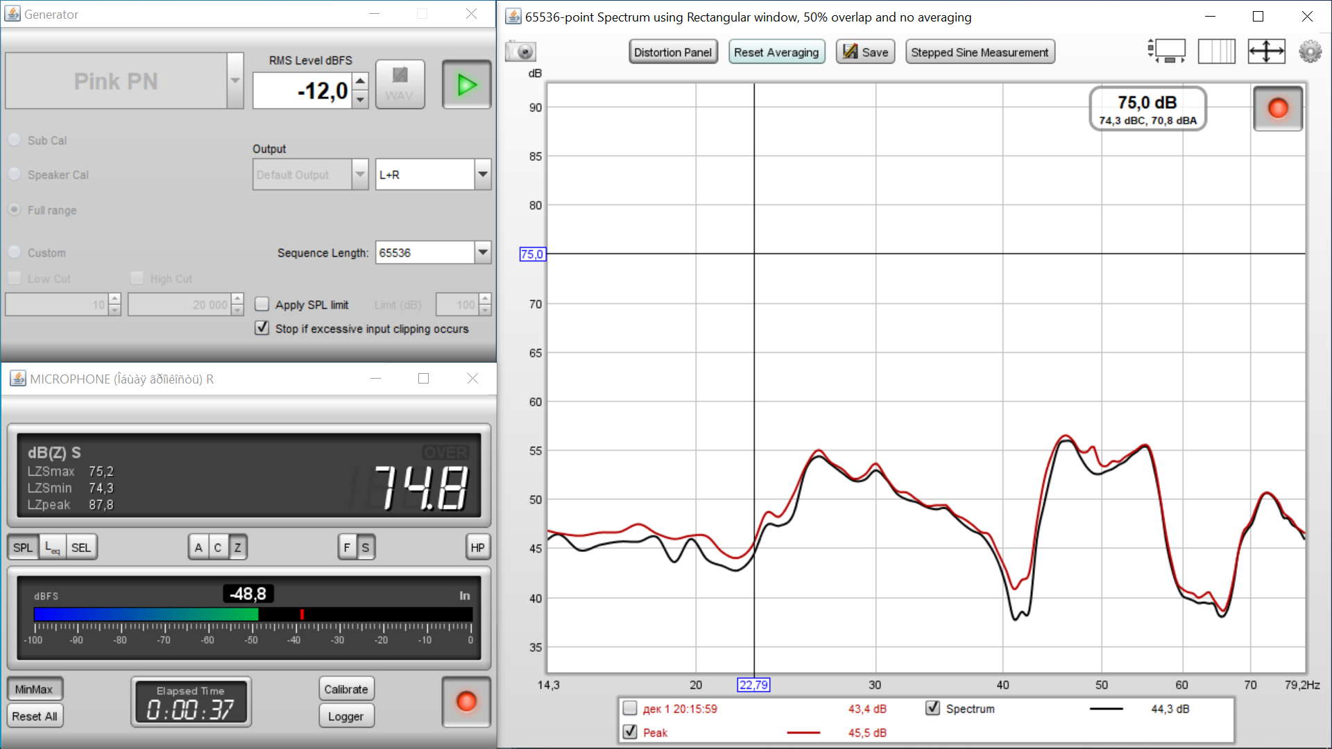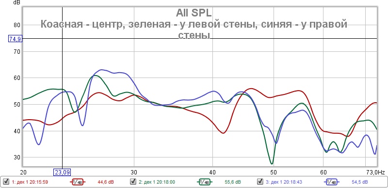 Цель эксперимента понаблюдать изменения только одной частоты - первой моды ширины комнаты (по рассчету 23Hz).