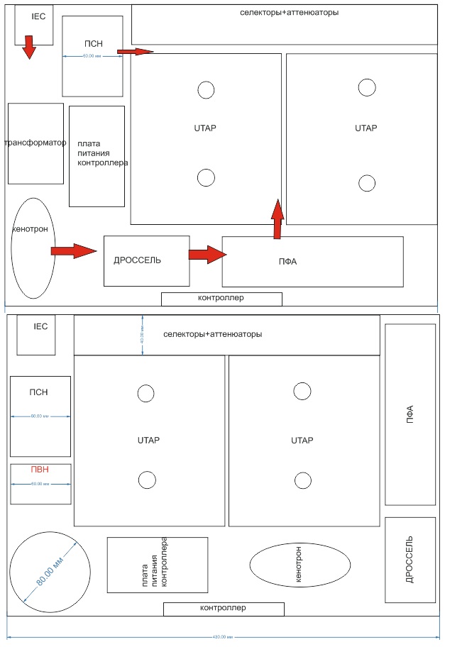 - теперь об остальном: на месте ПФА и дросселя предлагаю разместить БП накала, а на месте ПСН и ПВН - БП высокого (кенотрон и дроссель). Я понимаю, что то, как сделано сейчас в некотором роде уравновешивает между собой тяжёлые трансформатор и дроссель. Можно оставить и так, как есть, только тогда лучше ПФА и кенотрон всё же поменять местами.