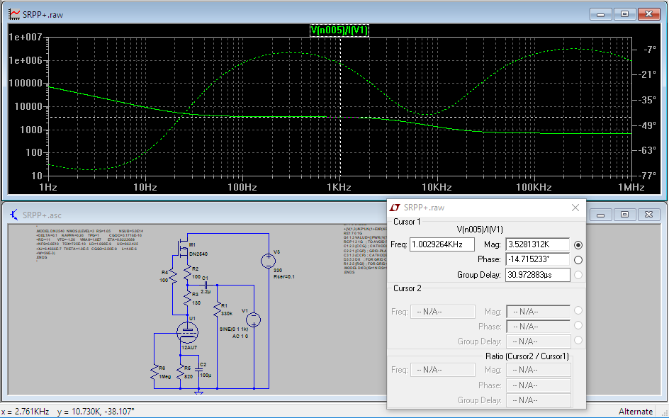 Я также смоделировал ещё раз SRPP+ по схеме, приведённой ранее с проверенными выше моделями. Вот что получилось: Расчёт по последней приведённой мной формуле с использованием определённых по моделям параметров элементов дал значение 3,3к, моделирование, как мы видим, даёт значение 3,5к. Я считаю разницу небольшой, моделирование просто принимает во внимание всякие паразитные вещи, типа ненулевого сопротивления конденсаторов (в катоде лампы и в нагрузку) и реальные рабочие характеристики.