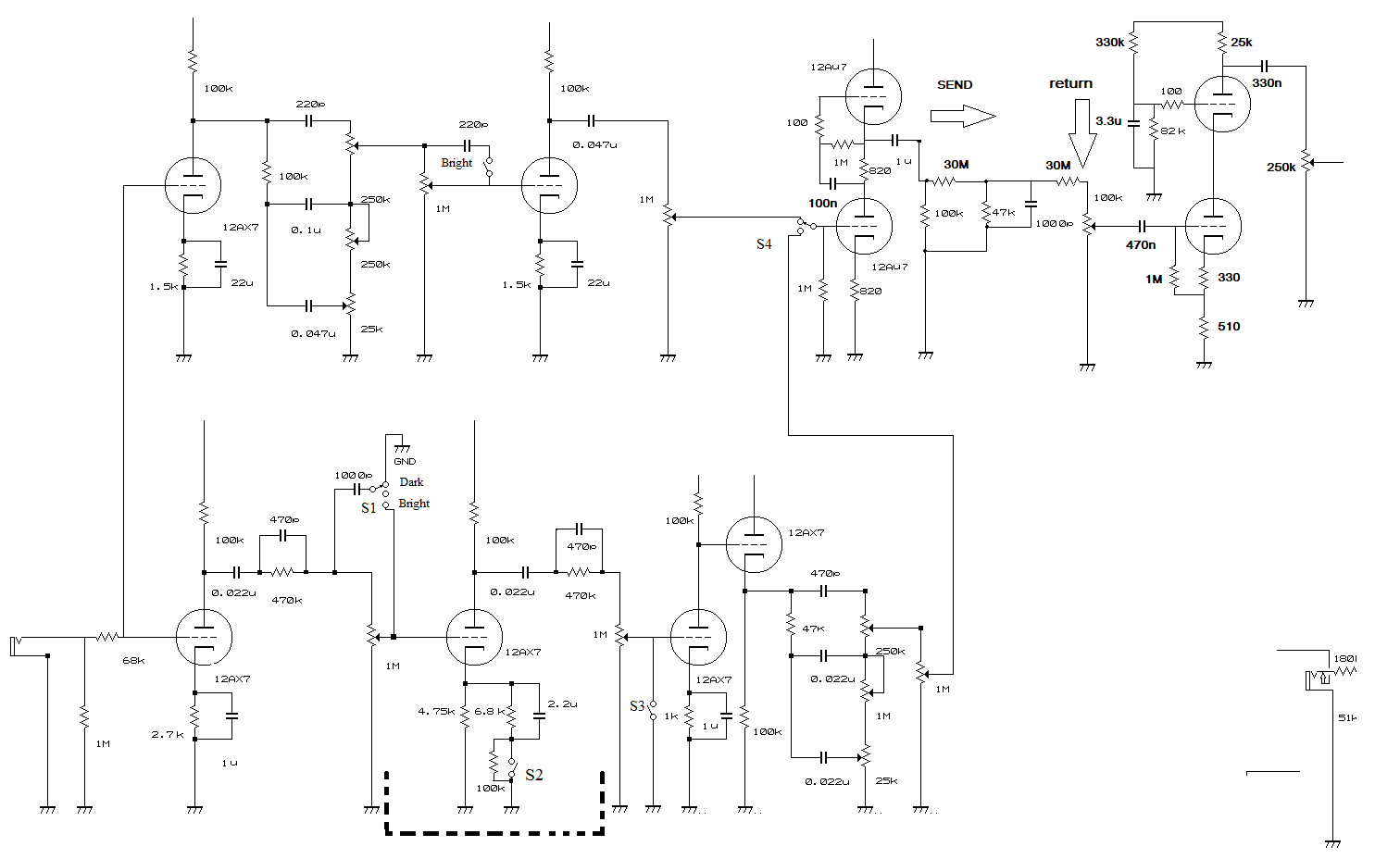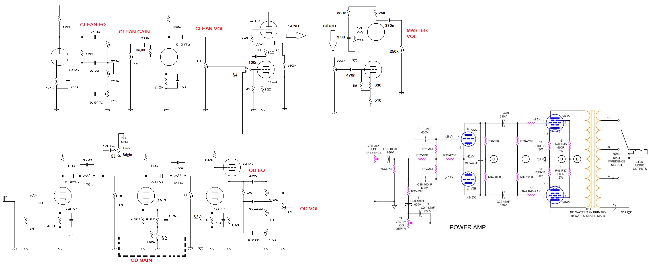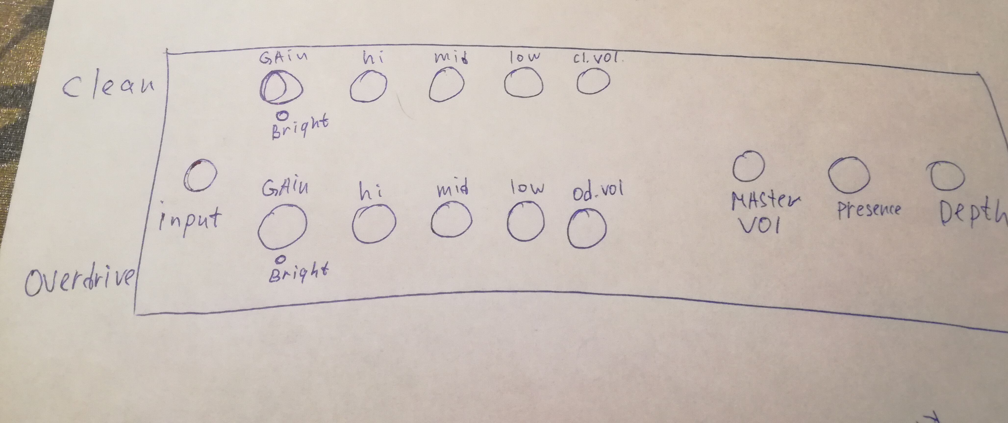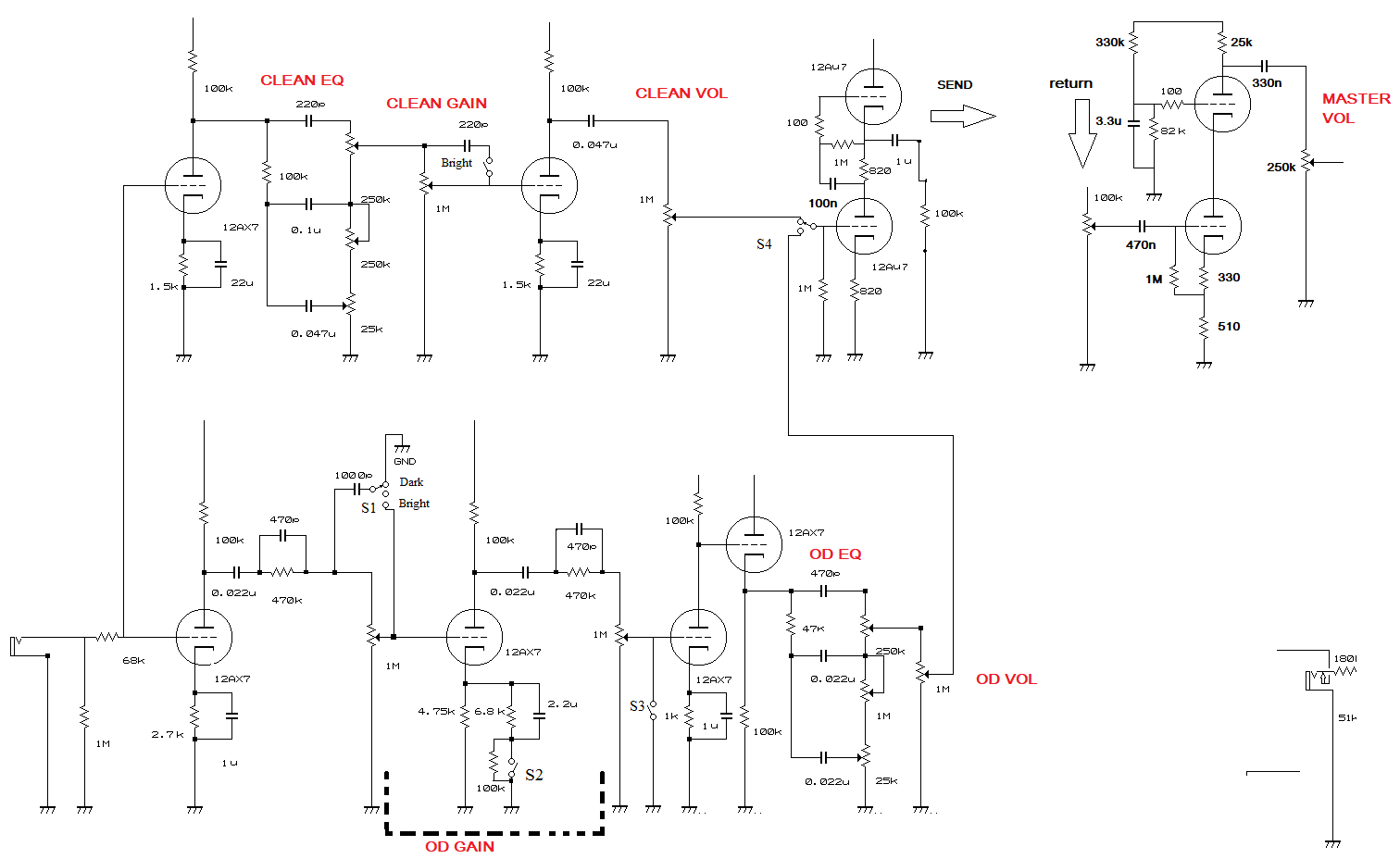 Ну смотрите, поверху у нас чистый канал, 1М - его громкость, понизу - овердрайв канал с его 1м громкостью. По сути гейн чистого канала - его же громкость, поэтому у AZG например на 9-й странице громкость вообще фиксирована делителем 330к/690к. Видимо этот делитель подбирался итерационно из рассуждений, что на чистом канале в максимальном положении ручки гейн громкость должна быть максимальной, при этом не должны уходить по звуку в овердрайв.