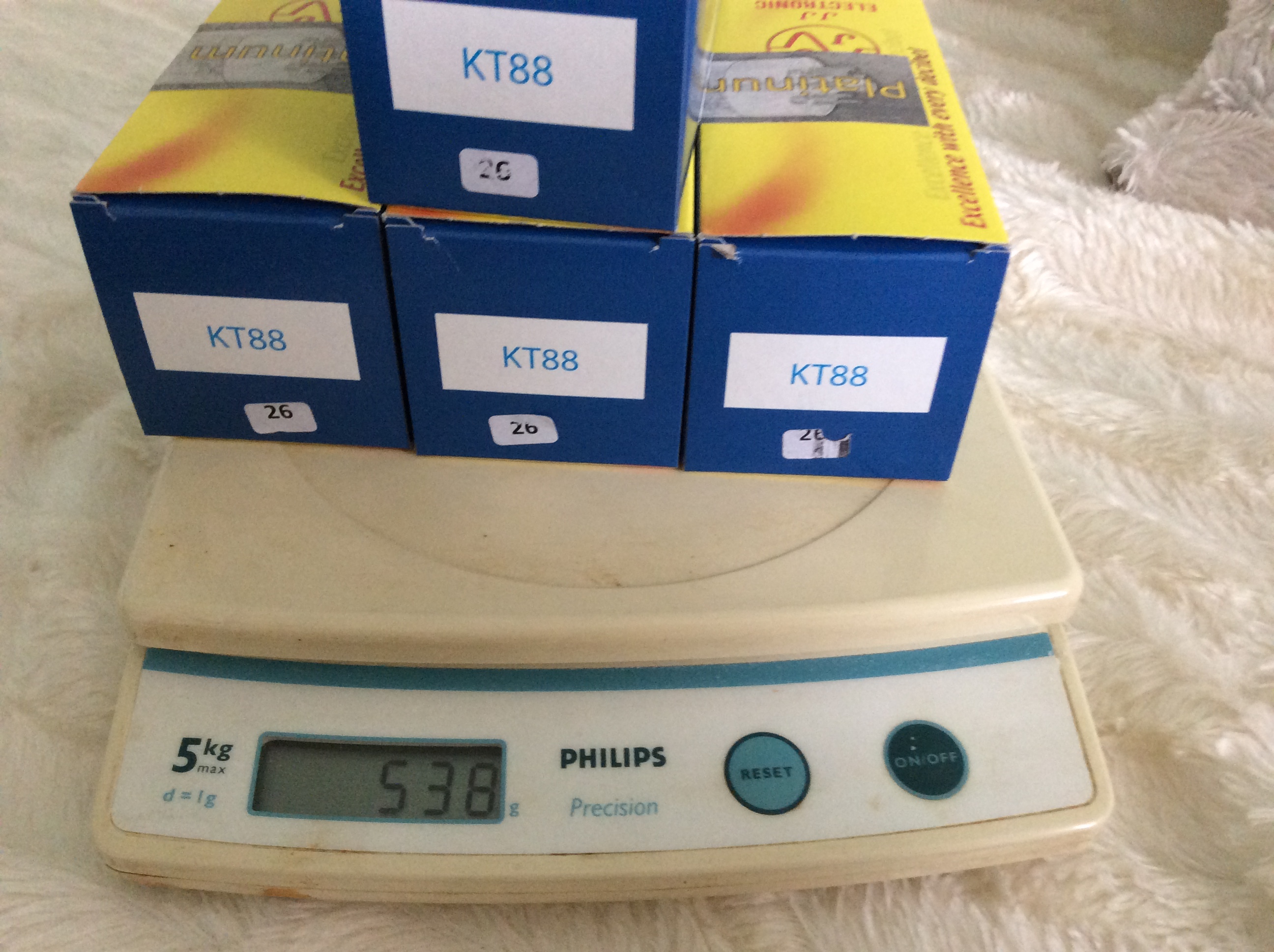 Случилось ЧУДО!! Заказанные и оплаченные 11 Марта сего года 4 лампы КТ88JJ приехали ко мне ( BanzaiMusik). Этому предшествовала длинная переписка с отправителем. Не вдаваясь в подробности констатирую: рад, что все завершилось хорошо, хотя конечно по нервничал. Не готов был к весу и размеру ламп. Очень большие и тяжёлые по факту. Глядя на характеристики в Datasheet, недооценивал их массогабариты. Лампы подобранные, все 4 шт. Имеют цифирь 26. То есть без особой разницы, как их спаривать. При этом радует, что обозначенная в марте цена не изменилась в большую сторону. Поскольку я не спешил, данная задержка никак не сказалась на проекте.