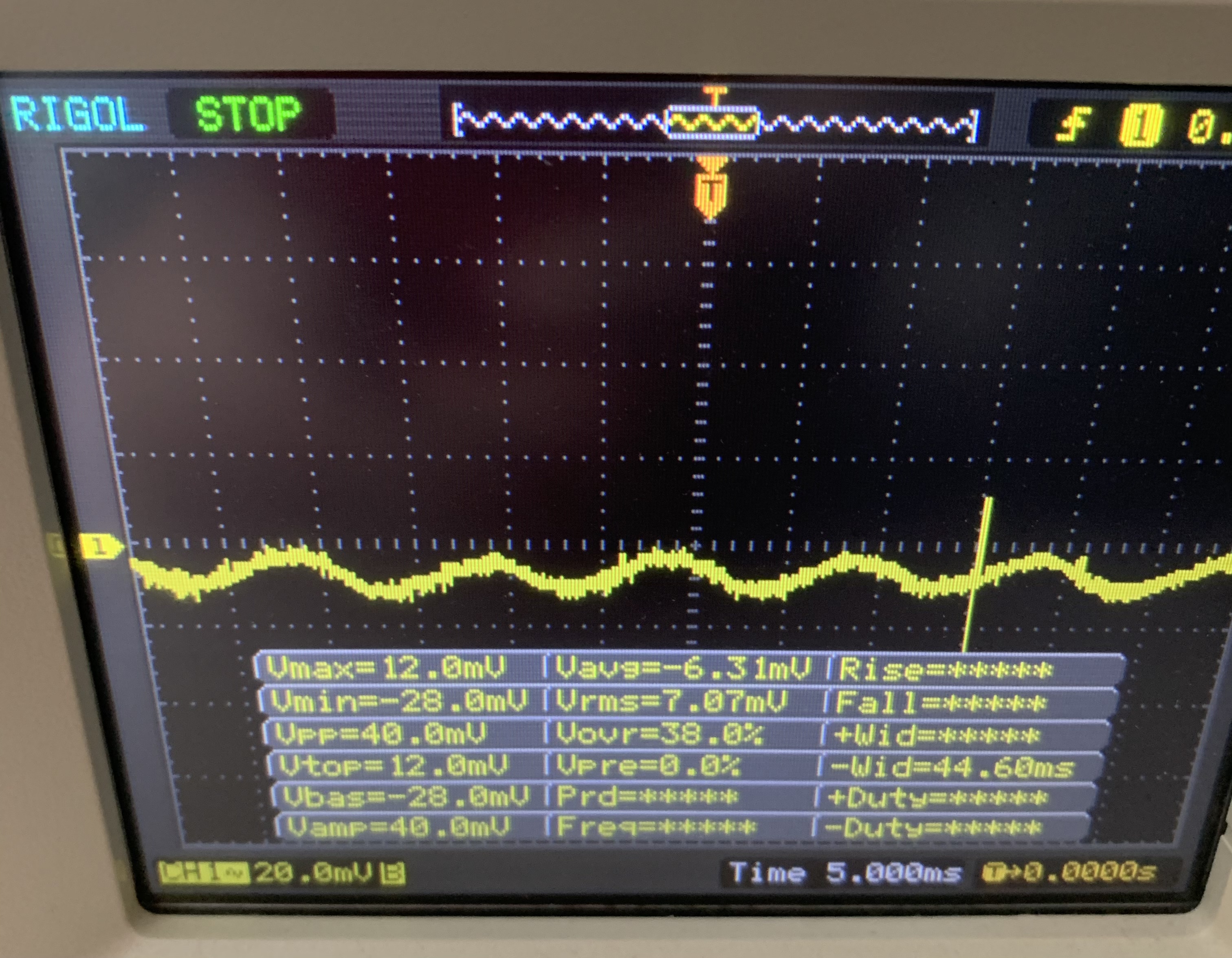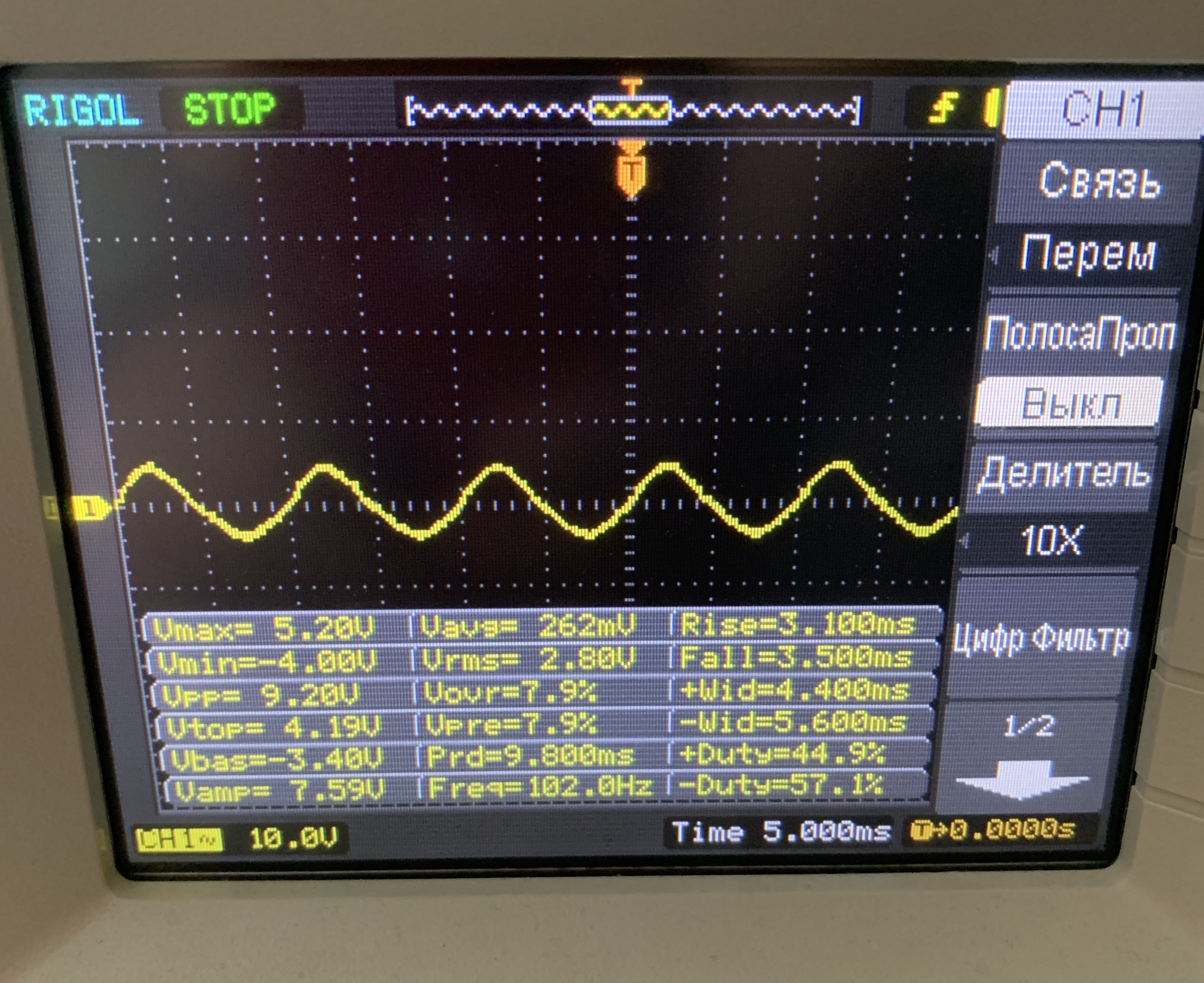 Vpp на входе - 9,2В, на выходе - 40мВ. Т.е. на выходе должно быть хотя бы 10мВ, не больше.
