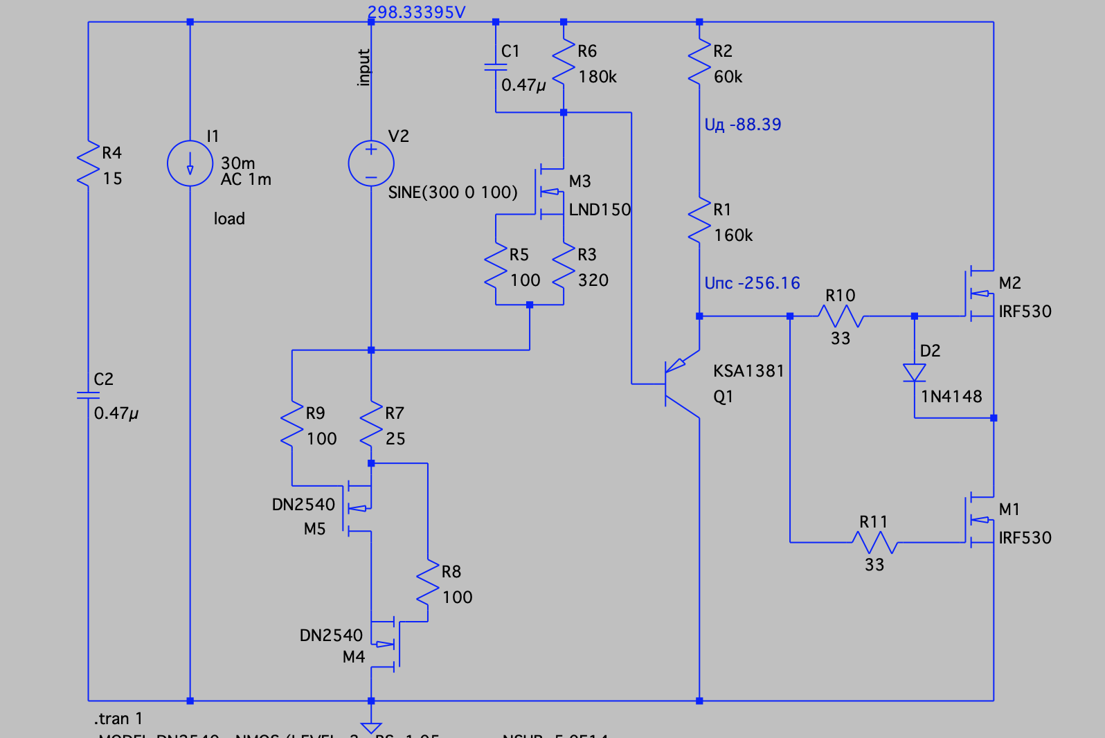 Выход получил такой, как надо. Единственное, сразу хочу отметить - 180к мало. Это проблема с моделью lnd150. Я уже сталкивался с этим в своей петле гитарника - сложно заставить lnd работать с большим током, мы получаем 1.5мА (Почти) при резисторе 320 ом, в реалии там чуть ли не до 20 ом приходится опускаться. Так что для удобства наруливания думаю надо увеличить 180к до 220к для получения более высоких значений падения напряжения на этом резисторе.